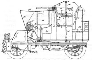 Unfortunately, soon after, Russia was forced to sign a humiliating peace with Japan following the defeat of Port-Arthur. The Russian General Staff refused to send the machine-gun to the east and proposed to test it around St. Petersburg. Nakashidze, sure of his success had ordered six additional copies, ie a total of twelve copies that were beginning to be assembled. The prototype of the so-called CGV 1906 was finished and then presented and tested on February 10, 1906 in Puteaux to personalities of the French army and immediately dispatched to Russia (patents Nos. 363 712 and 363 713 of 13/02/1906 cover The dome system for light artillery pieces - central pivot for assembly on the automobile and the war car). So there will be only one vehicle arriving in St-Petersburg on March 8, 1906.