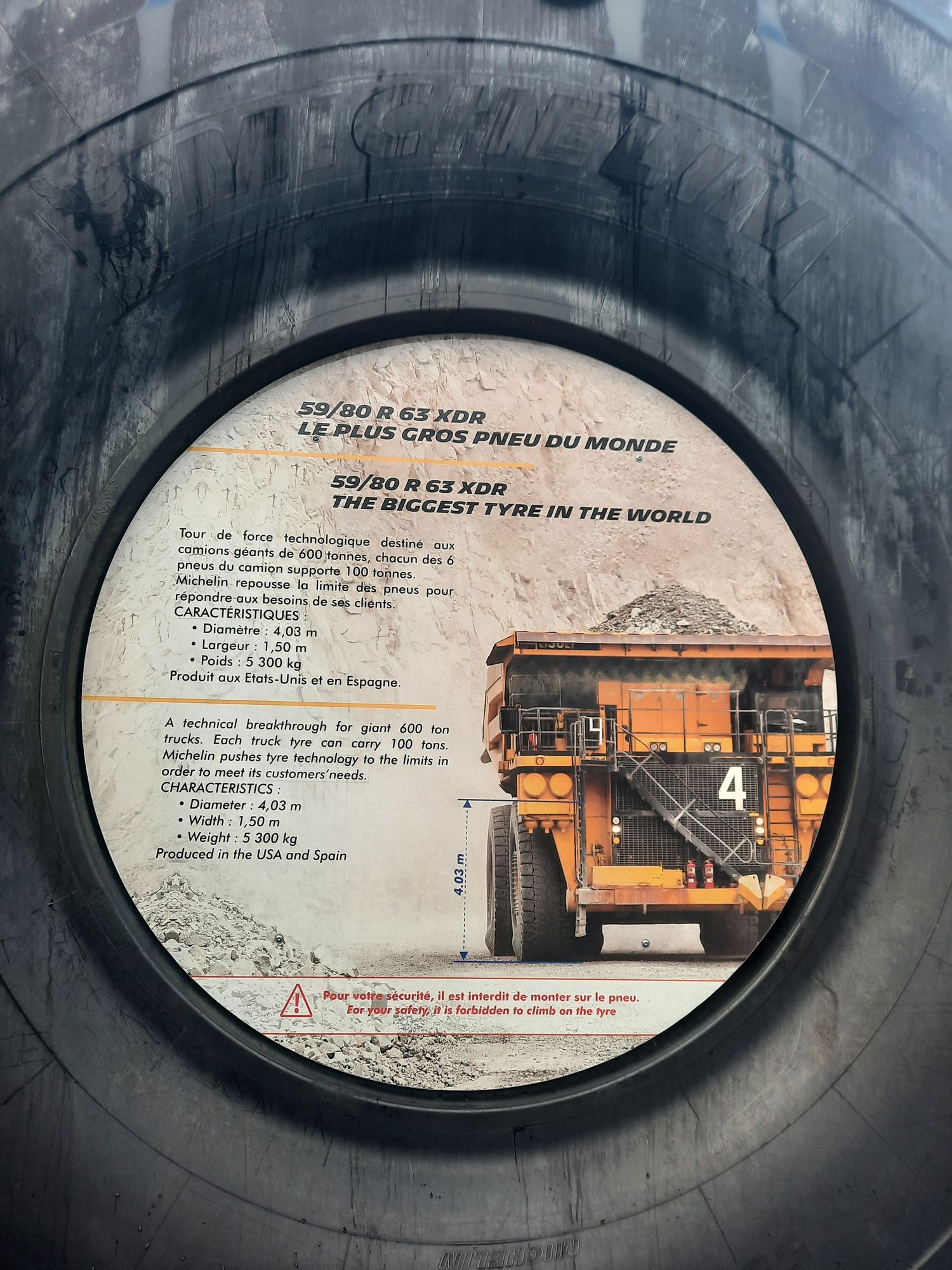 Merci à Vincent pour certaines Photographies Histoire voir ICI Michelin produit le plus grand pneu au monde. Il s’agit du pneu géant 59/80R63 pour engins d’excavation minière (Caterpillar 797B). Son diamètre est de 4 mètres pour un poids de 5 tonnes. Son coût quant-à-lui avoisine les 30 000 euros / pièce.
