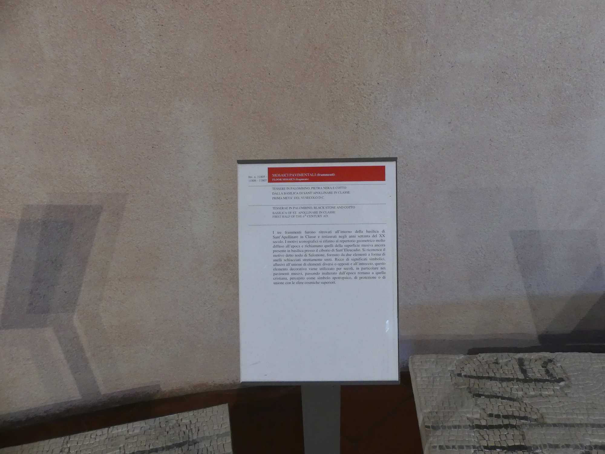 Le pavement orignel de la basilique a disparu Quelques Fragements se trouvent encore in situ d'autres sont conservés au Musée San Vitale à Ravenne