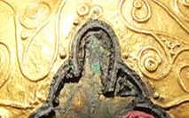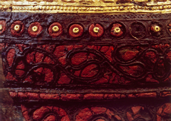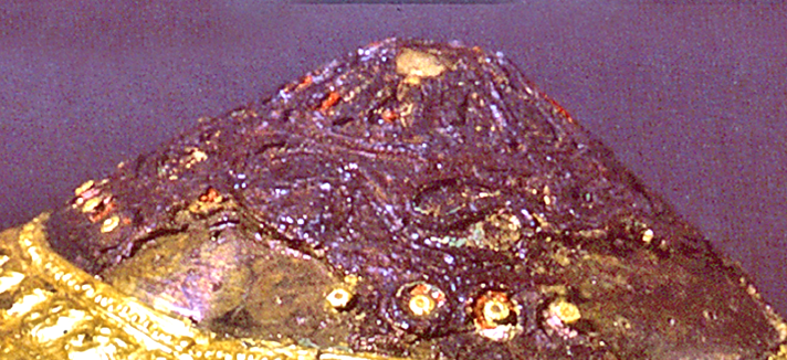 De petits clous de bronze à tête recouverte de feuille d’or maintiennent les extrémités des bandes d’or