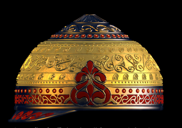 L’OR DU CASQUEDes échantillons d'or prélevés sur divers éléments du casque ont été analysés. L'or est assez pur et contient 4 à 6% d'argent et 0,6% de cuivre. Grâce à une série d'examens au microscope électronique à balayage, on peut reconnaître les signes du travail sur la feuille d'or : battage, lissage, application.