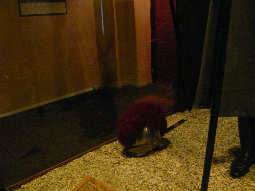 Un petit cimier recouvre la partie supérieure de la bombe et il est constitué de deux ailerons et d'une entretoise. L'aileron est forgé à partir de l'étirement du haut de la demi-coque. Sur l'entretoise qui solidarise les deux ailerons repose la chenille de crin écarlate.