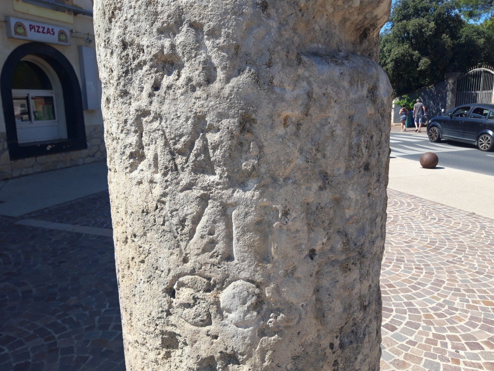 Cette borne milliaire a été installée à Sauvian vers 44 de notre ère sous le règne de l'empereur Claude 1er. Elle mesure 1,38 m de haut. Elle se trouvait à l'intersection de trois voies secondaires de la Via Domitia. sur une route annexe de la Narbonnaise, pour indiquer le chemin aux voyageurs et convois qui venaient de Rome. On installait alors ces bornes tous les 1478 mètres -lieue gauloise-, jusqu’au forum de Rome, le « point zéro Le texte gravé desssu a été reconstitué , CIL XVII-2, 1986, inscr. 288 (CIL XVII2, 00288) : Puis elle fut ensevelie et disparut, au fil des siècles et des invasions. Elle fut retrouvée par hasard en 1820 par un vigneron, M. Iché, alors qu’il travaillait sa vigne, à quelques mètres de l’endroit où elle se dressait à l’origine. Il restaura l’inscription latine, posa la borne sur un socle sur lequel fut scellée une croix en fer, d’où le nom du lieu : chemin de la croix de fer. Le tout fut installé chemin du Thou, à l’intersection de quatre voies.La borne y resta jusqu’en 1986. Elle fut installée sur la promenade, et enfin à l’intersection de 2 passages pavés |