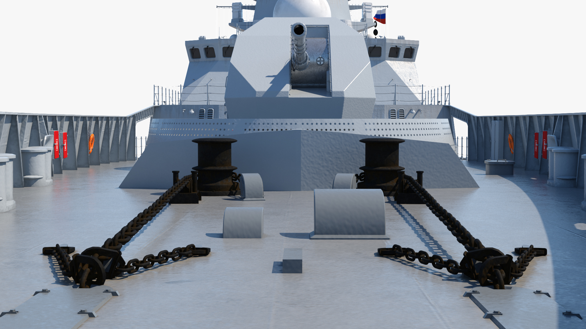 Deuxième catégorie abordée, les armements défensifs. Répondant au nom de 9K96 Poliment-Redut, le système de défense antiaérienne embarqué est une variante adaptée pour l’emploi en milieu naval du S?350 Vityaz, ce dernier faisant usage de missiles développés pour le système S?400.