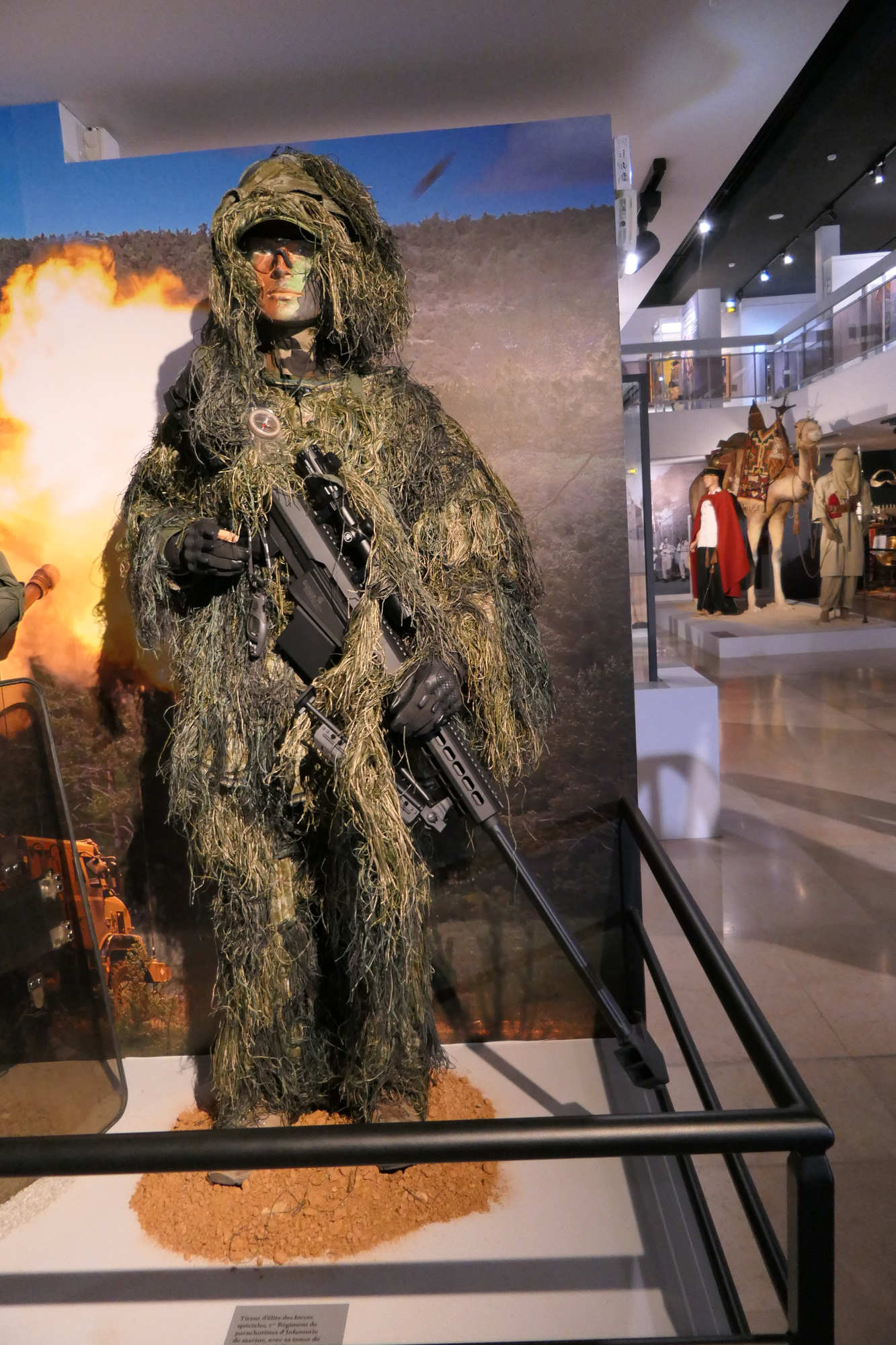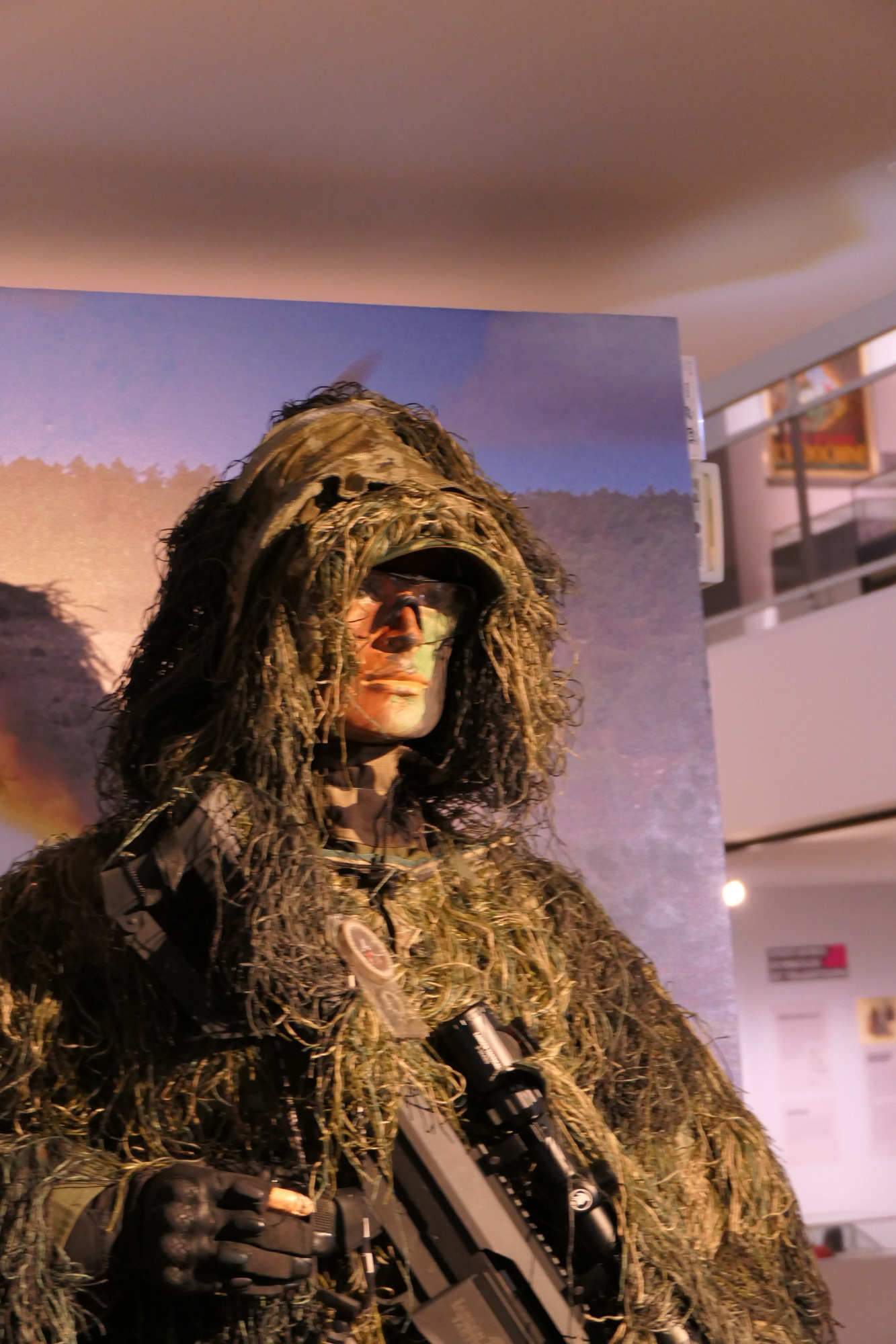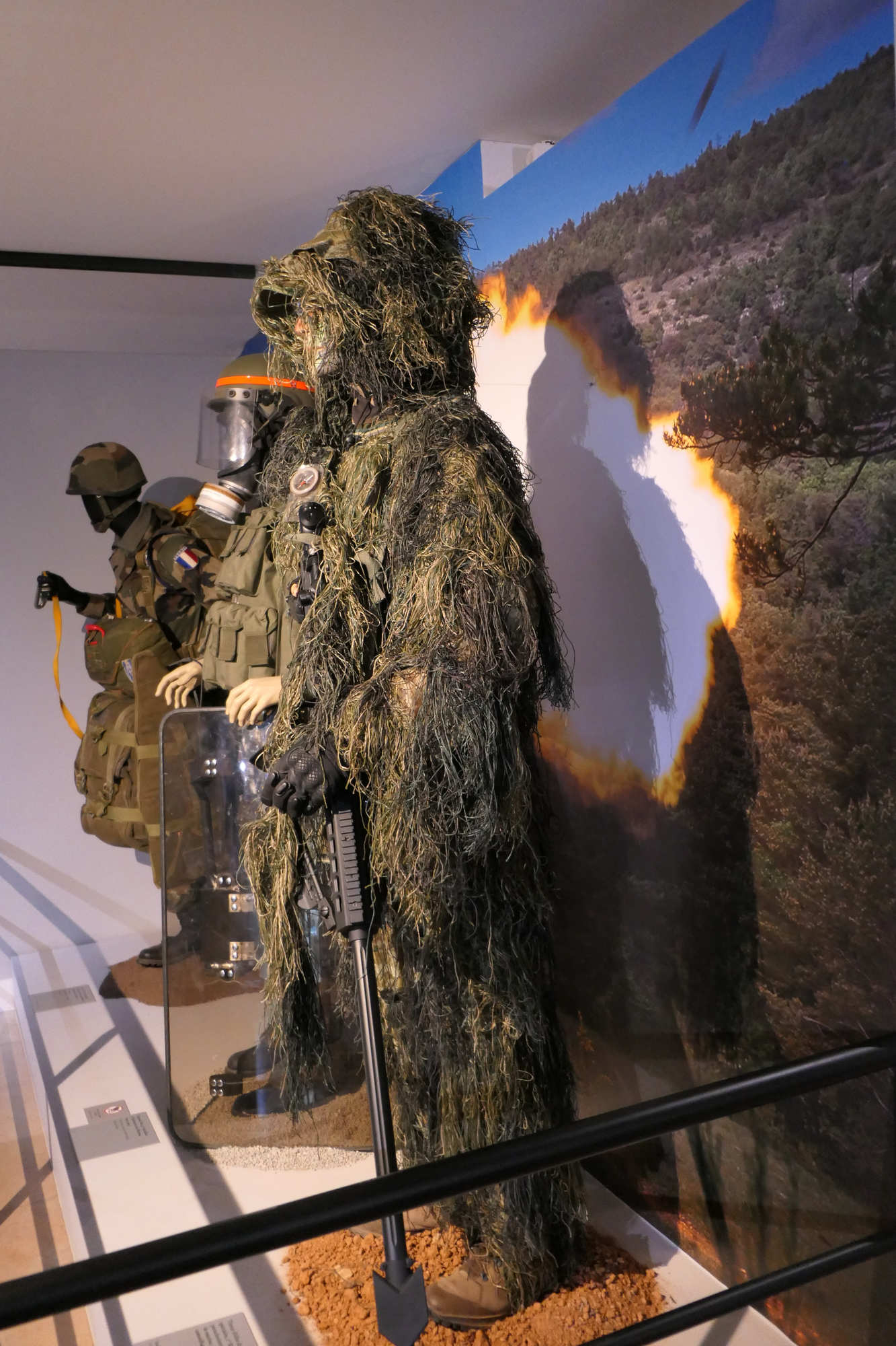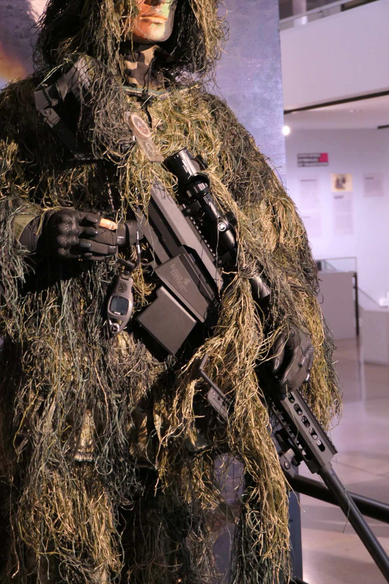 Ce tireur d 'élite est revetu de la tenue de camouflage Ghillié La ghillie suit a été inventée par les garde-chasse écossais qui cherchaient à attraper les braconniers. Le terme Ghillie vient de la langue gaélique écossaise (Scottish Gaellic), et désigne de petits êtres comparables aux lutins, ayant la faculté de se changer en feuille ou en plante pour se cacher, connus en anglais sous le nom de brownies.