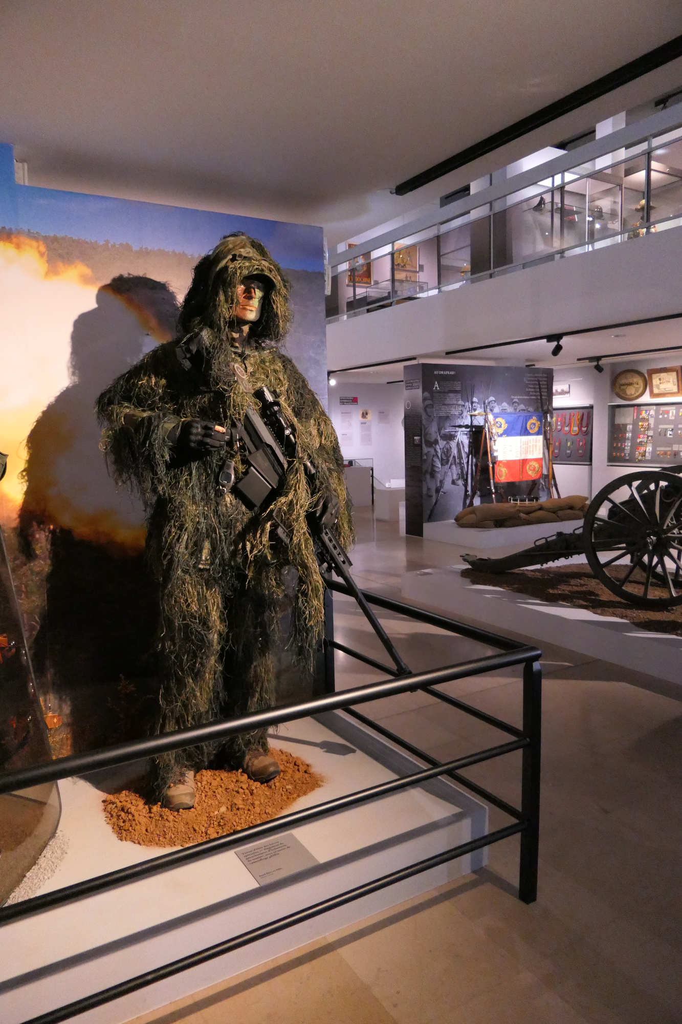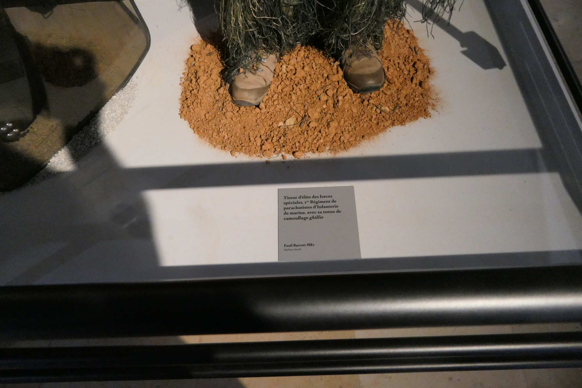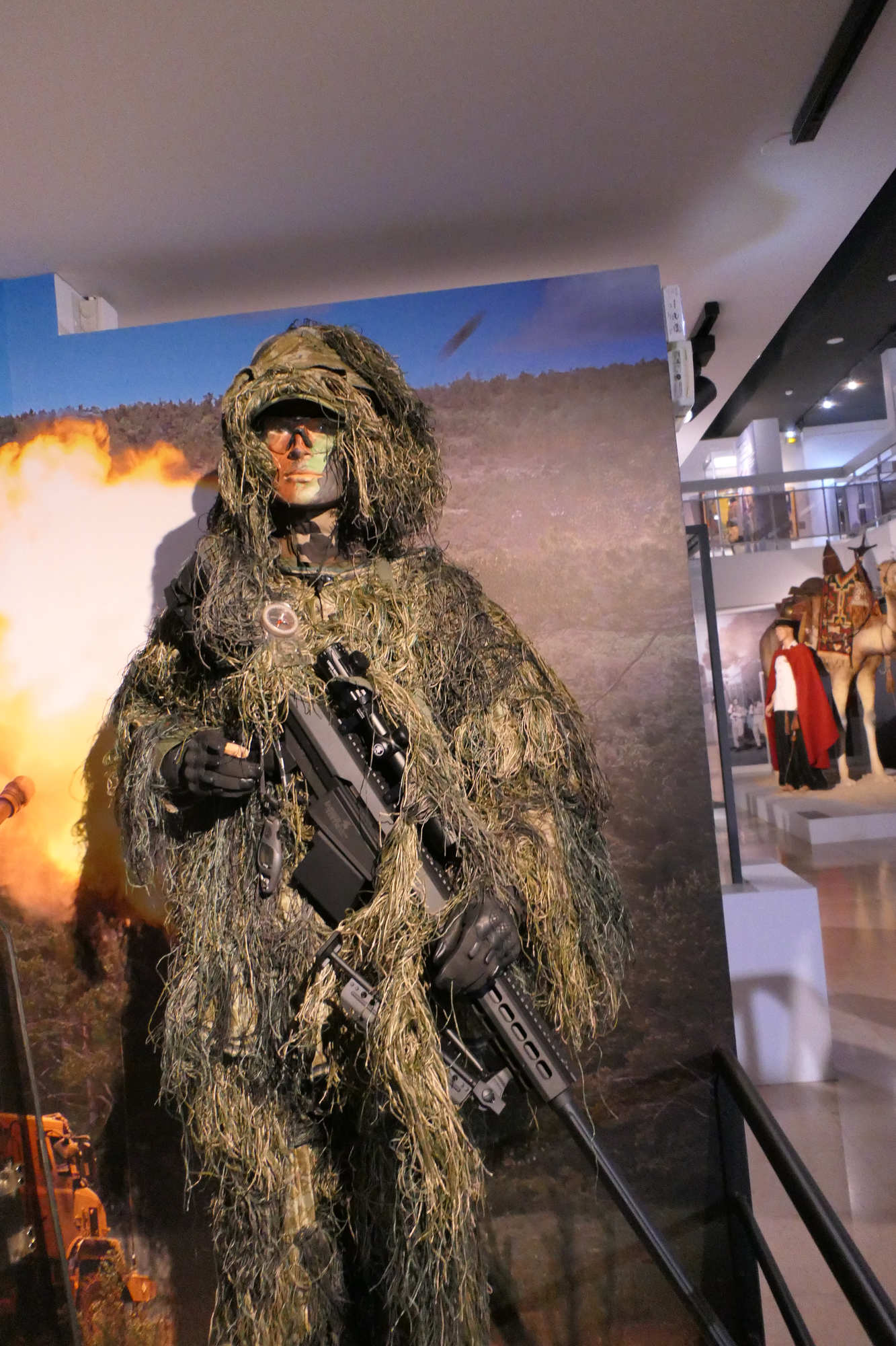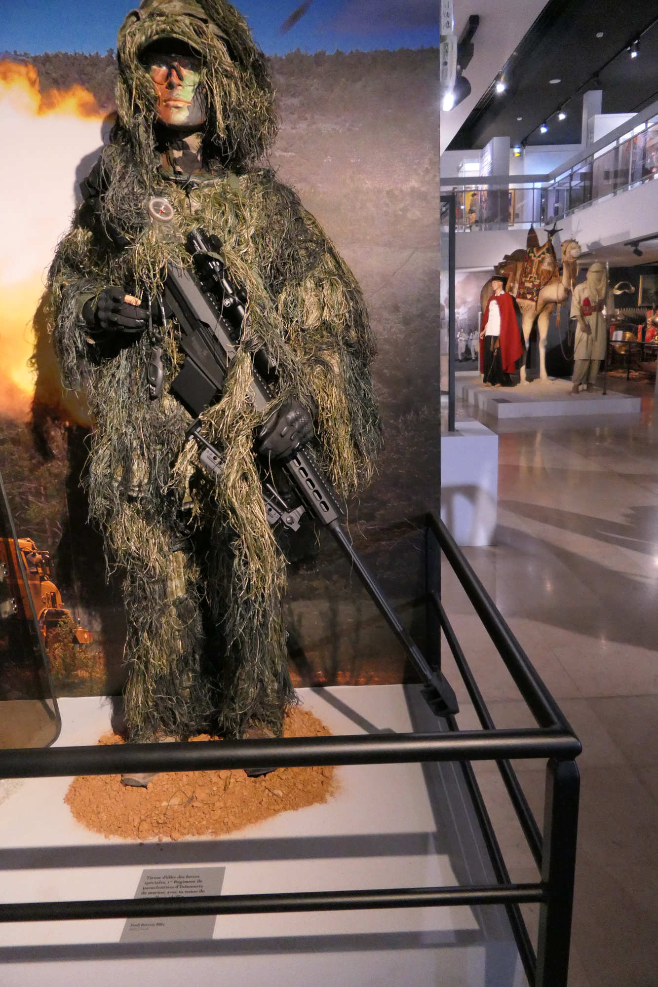 Ce tireur d 'élite est revetu de la tenue de camouflage Ghillié La ghillie suit a été inventée par les garde-chasse écossais qui cherchaient à attraper les braconniers. Le terme Ghillie vient de la langue gaélique écossaise (Scottish Gaellic), et désigne de petits êtres comparables aux lutins, ayant la faculté de se changer en feuille ou en plante pour se cacher, connus en anglais sous le nom de brownies.