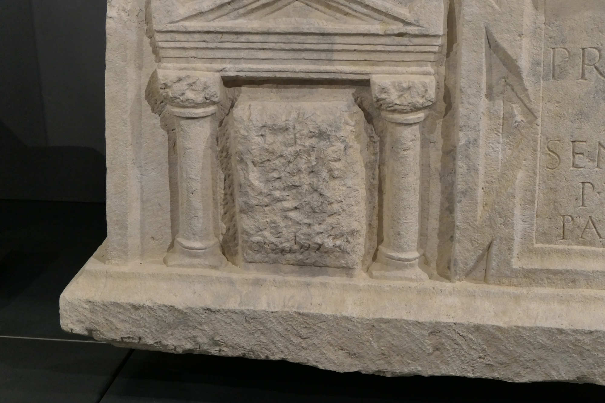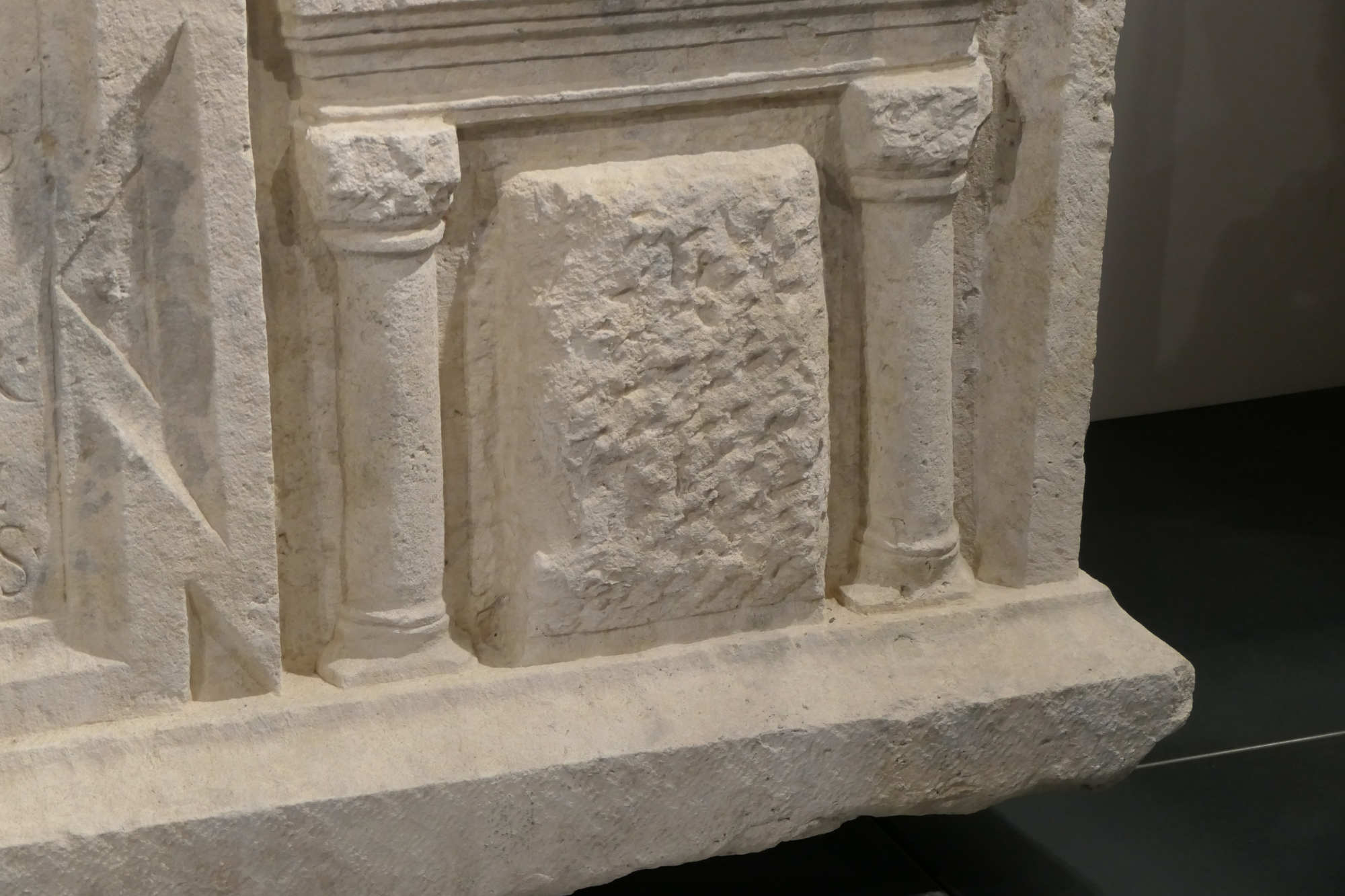 En son centre se trouve l’inscription funéraire texte gravé qui est appelé Tabula Ansate ( Tablette munie d'anses) .