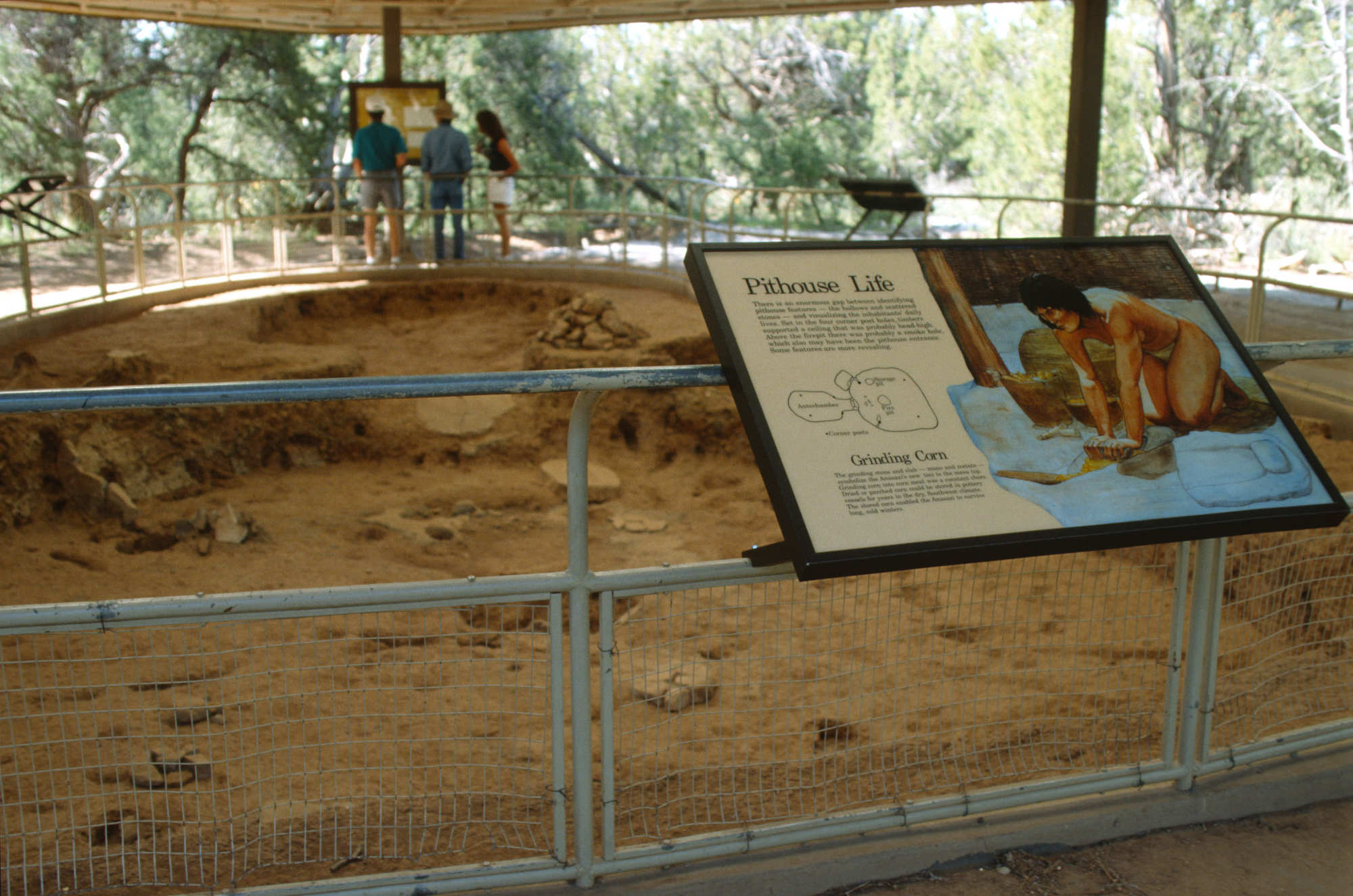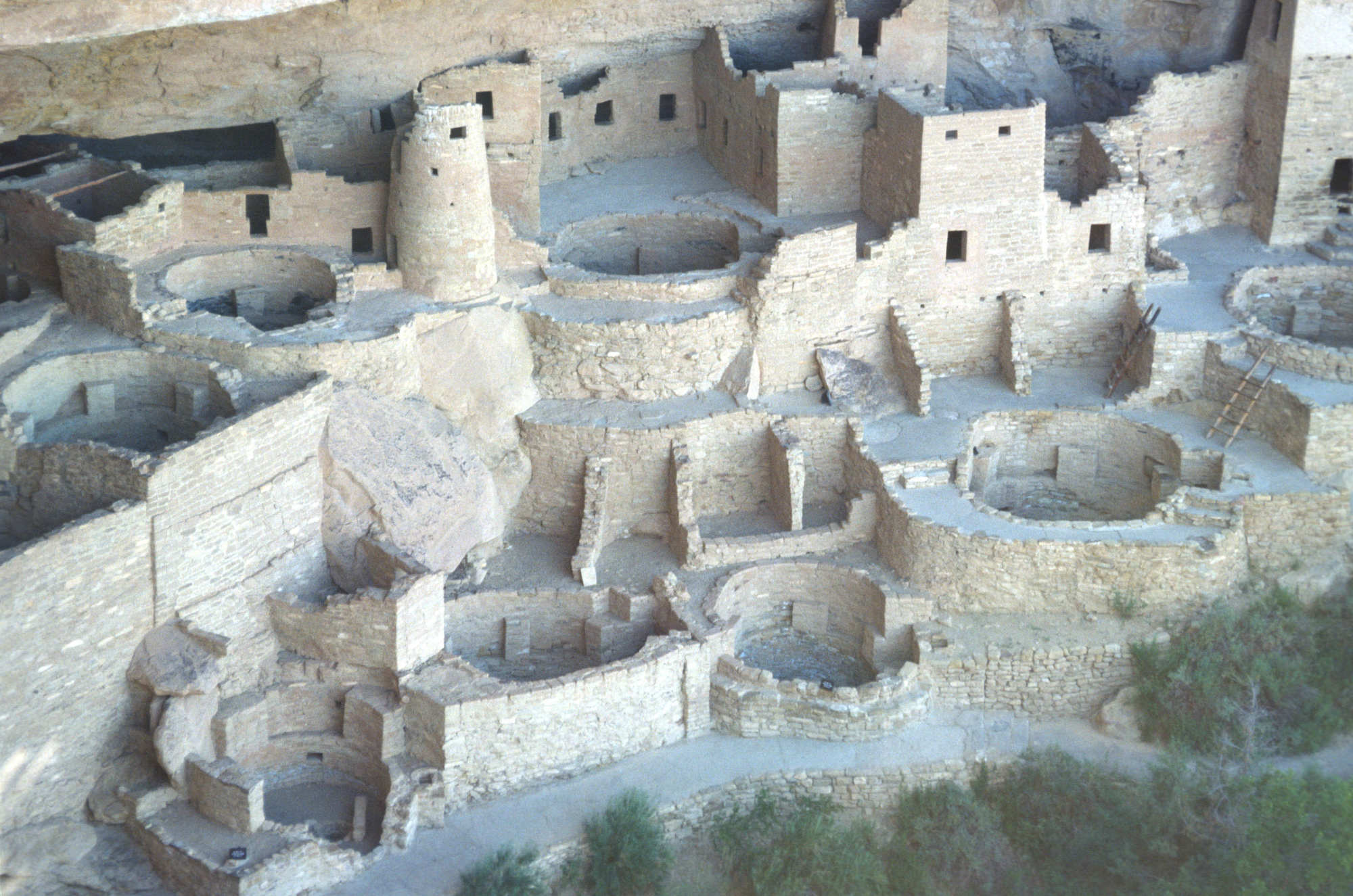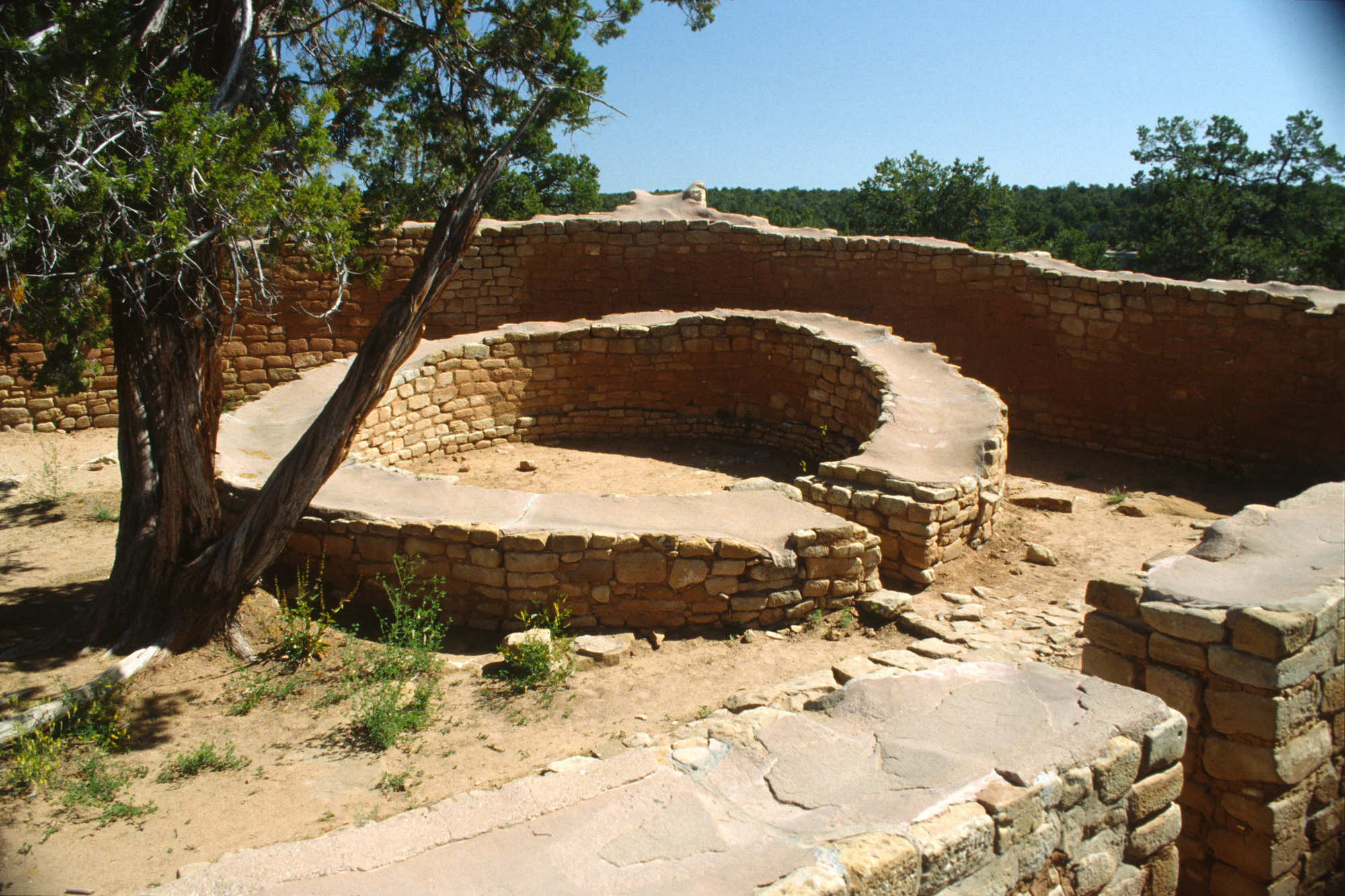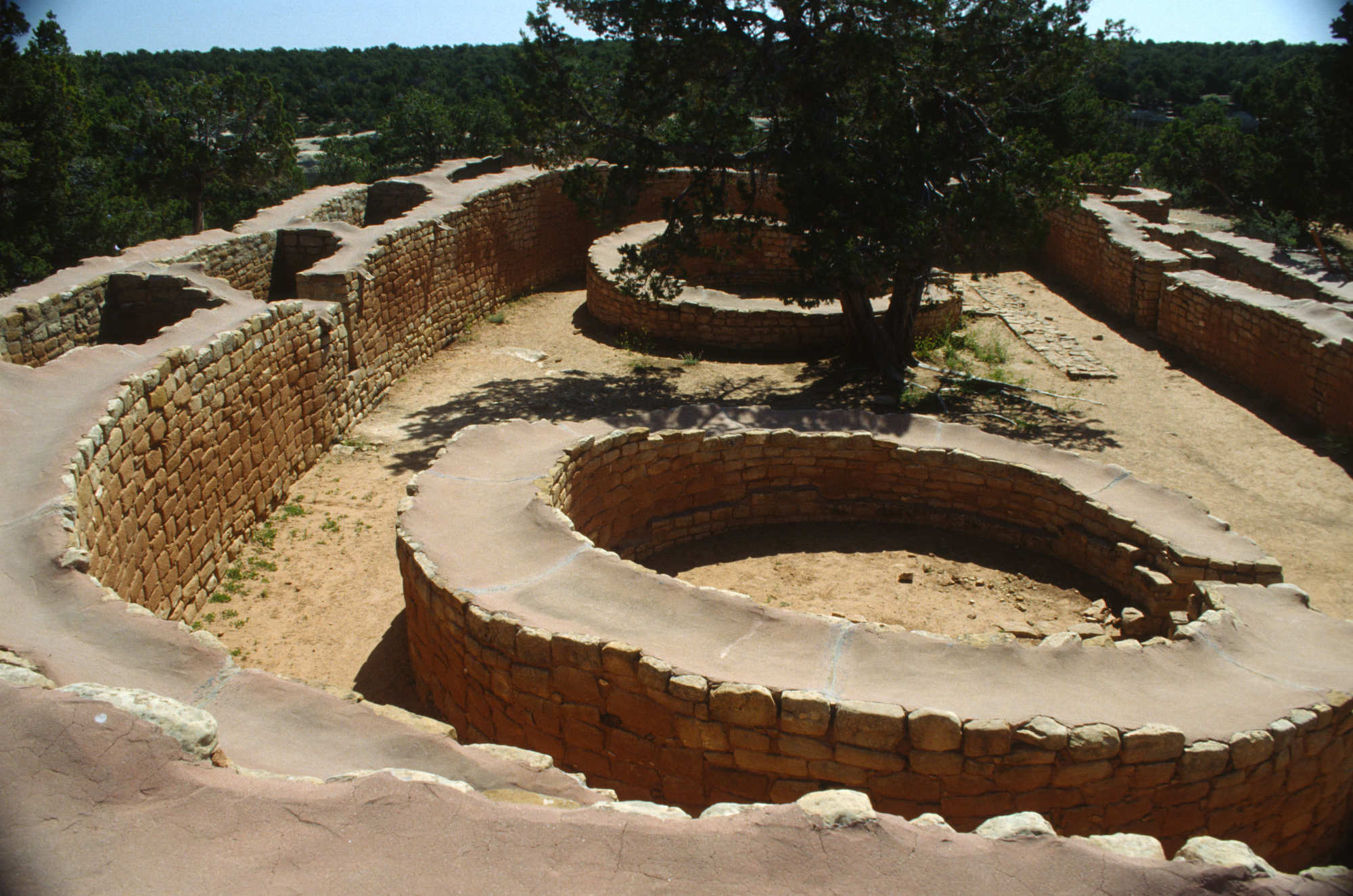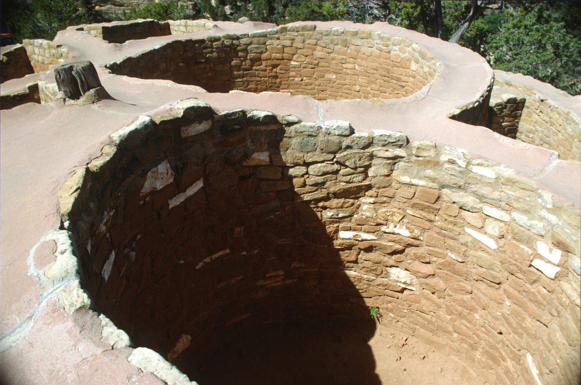 Les kivas comportent des banquettes le long des murs et on y accédait par des ouvertures au plafond à l'aide d'échelles. Ces kivas témoignent de la vie religieuse et sociale des habitants de Mesa Verde. Bien que les toits des anciennes kivas des habitations troglodytiques de Mesa Verde aient disparu, leurs murs circulaires et leurs détails architecturaux subsistent et font l'objet d'études et d'interprétations. Ces structures se distinguent par leur conception et leur utilisation des « maisons-fosses » plus anciennes, marquant une évolution culturelle dans les pratiques résidentielles et rituelles de la région du plateau de Mesa Verde.