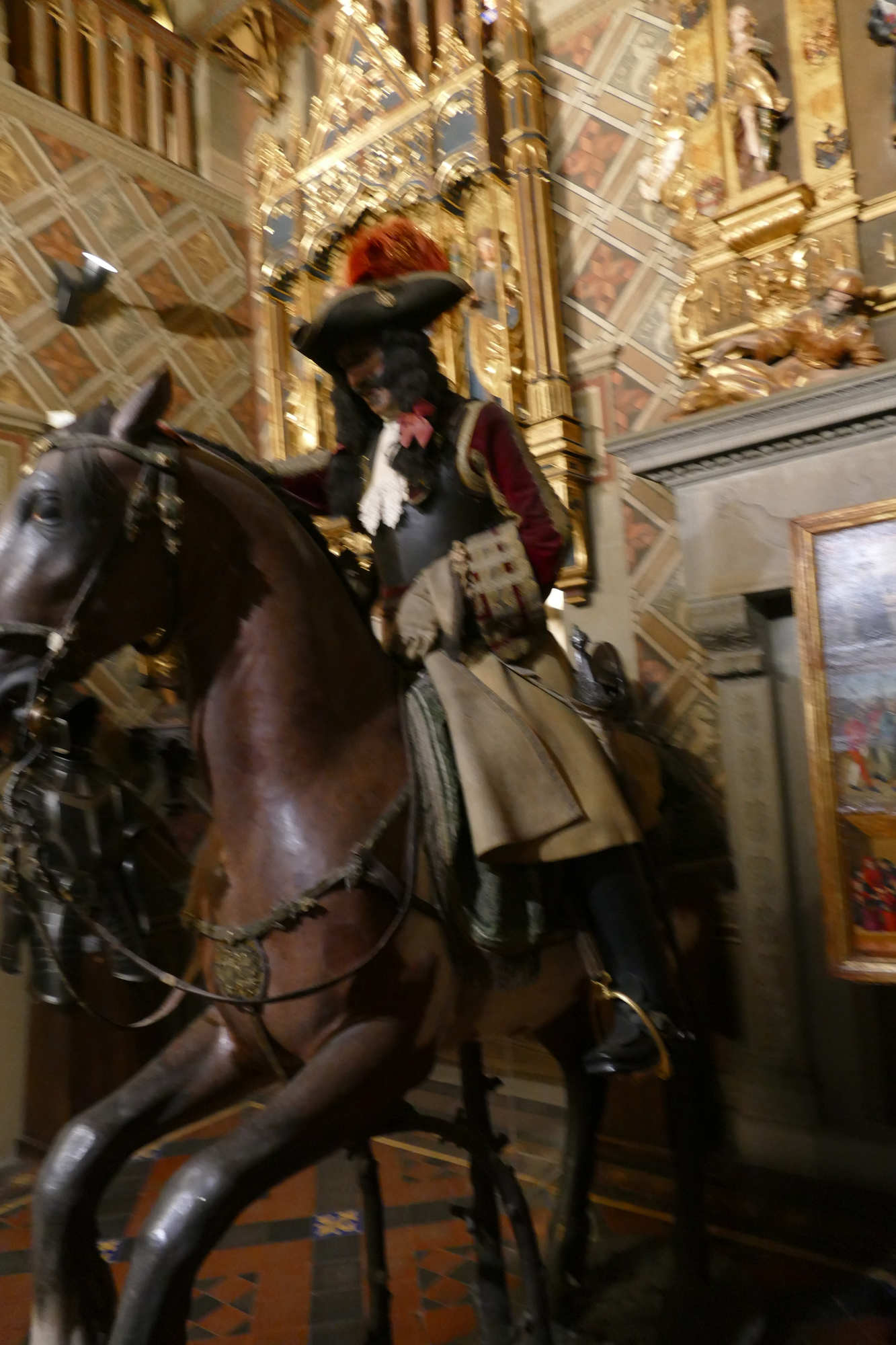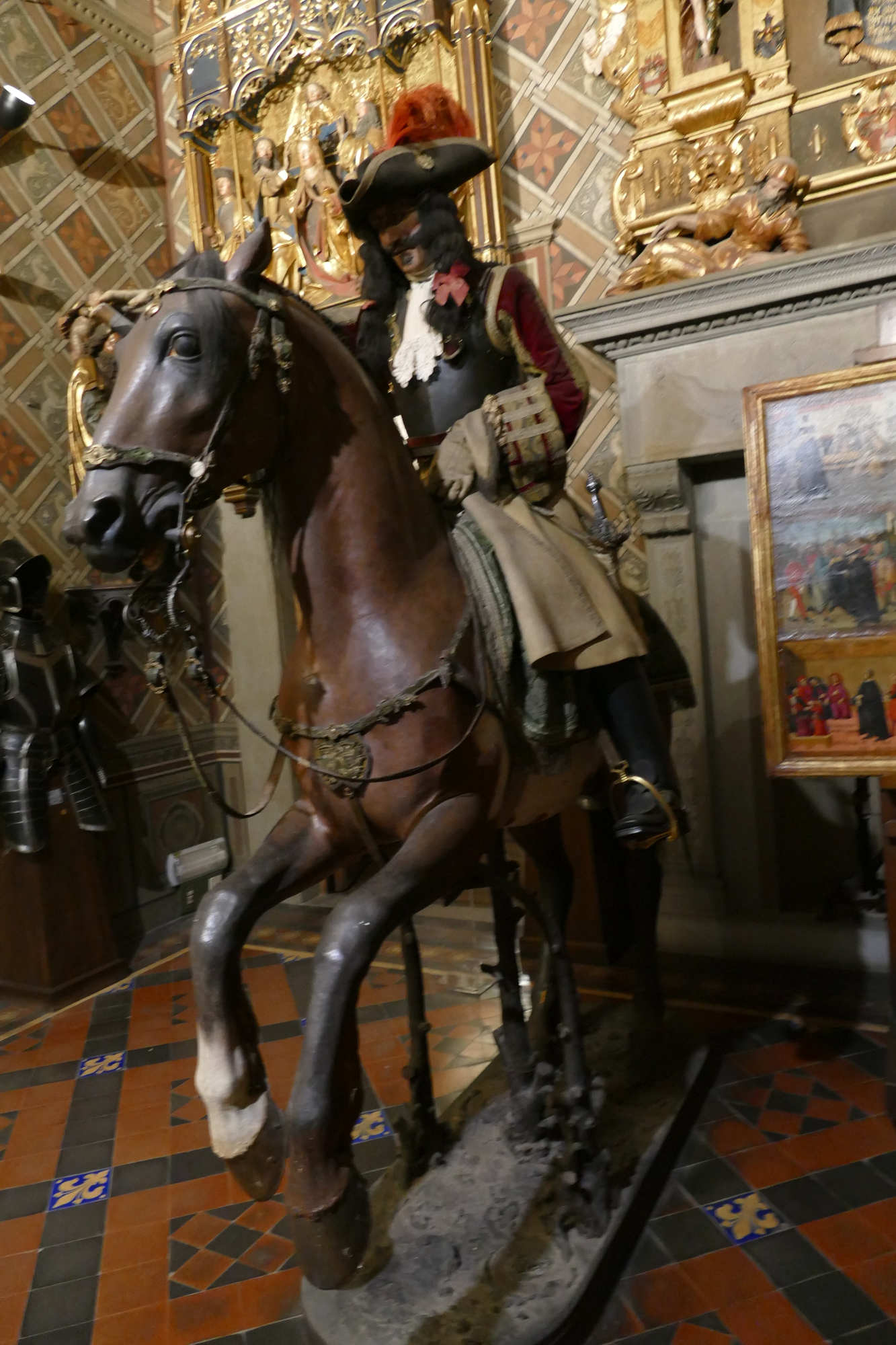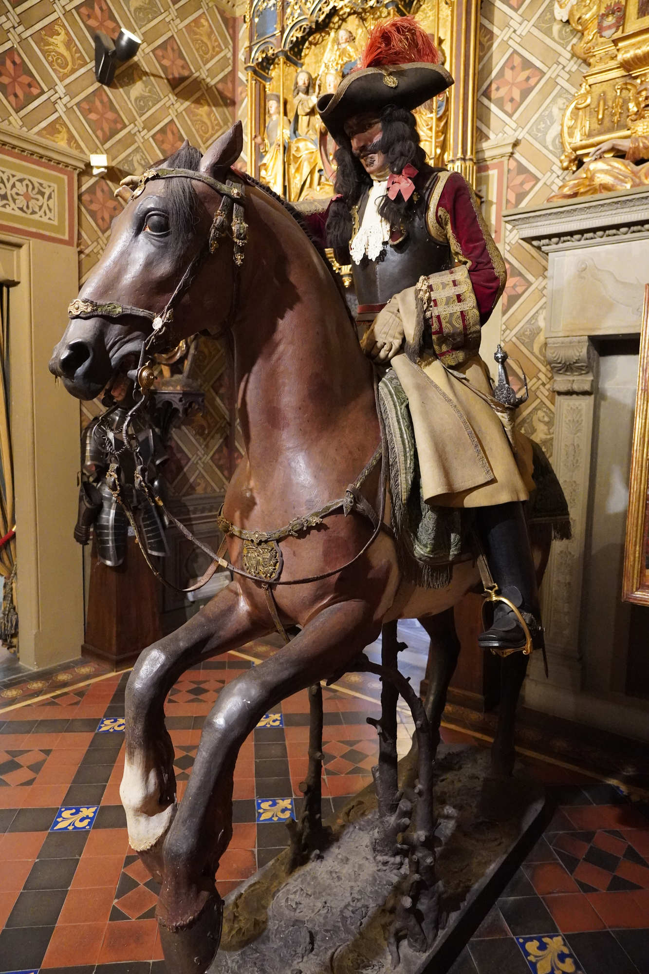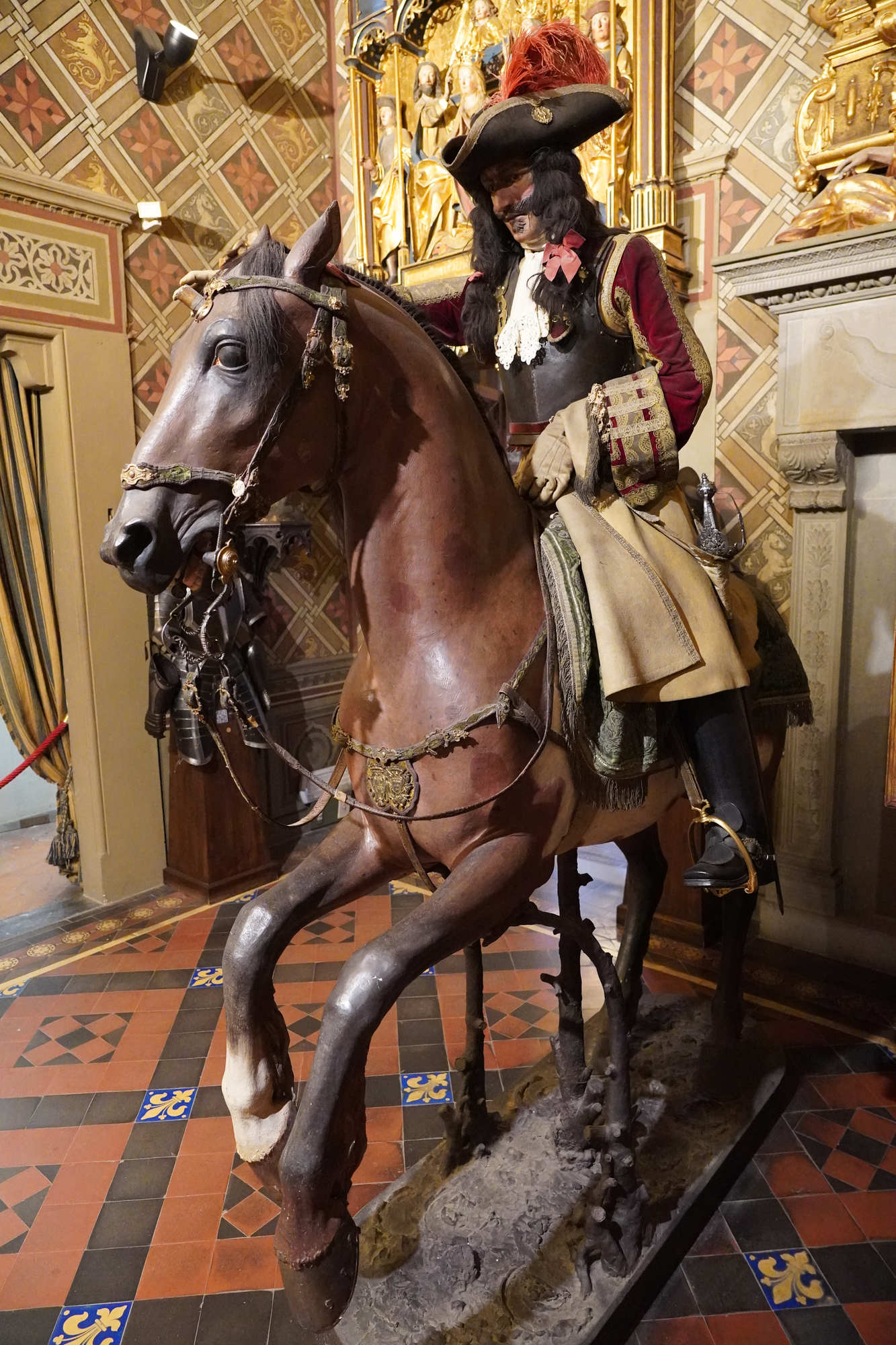 Organisation du régiment en 1665 Le régiment était généralement divisé en plusieurs escadrons entre 2 et 3 , chaque escadron comptant environ 120 à 140 cavaliers. Chaque escadron était lui-même subdivisé en 6 à12 compagnies (ou « pelotons »), rassemblant chacun environ 30 à 40 hommes. L’effectif total d’un régiment variait souvent autour de 500 à 600 hommes, répartis dans 4 à 5 escadrons selon l’époque et les besoins. À la tête du régiment se trouvait le colonel, souvent un noble ou une personnalité militaire notable, avec un lieutenant-colonel comme second. Chaque compagnie était commandée par un capitaine, assisté de lieutenants et sous-lieutenants, soutenus par des sous-officiers.Les cuirassiers portaient une cuirasse complète (plastron et dosseret), un casque type morion ou sallet, un sabre, la lance et parfois des pistolets, montés sur des chevaux bardés. L' Etendard L’étendard d’un régiment de cuirassiers sous Louis XIV était un symbole militaire prestigieux, riche en significations historiques et emblématiques. Description de l’étendard Les couleurs de l’étendard varient, mais souvent la soie bleue ou blanche dominait, avec des ornements dorés pour souligner le faste royal. Chaque régiment avait sa propre version d’étendard avec des inscriptions rappelant ses exploits et son allégeance au roi. Fonction L’étendard remplissait à la fois une fonction cérémonielle (porté en parade, lors des levées de régiment ou campagnes), et une fonction pratique sur le champ de bataille, servant de point de ralliement pour les soldats. Il incarnait l’honneur du régiment et devait être protégé à tout prix; sa perte était un sujet de disgrâce.