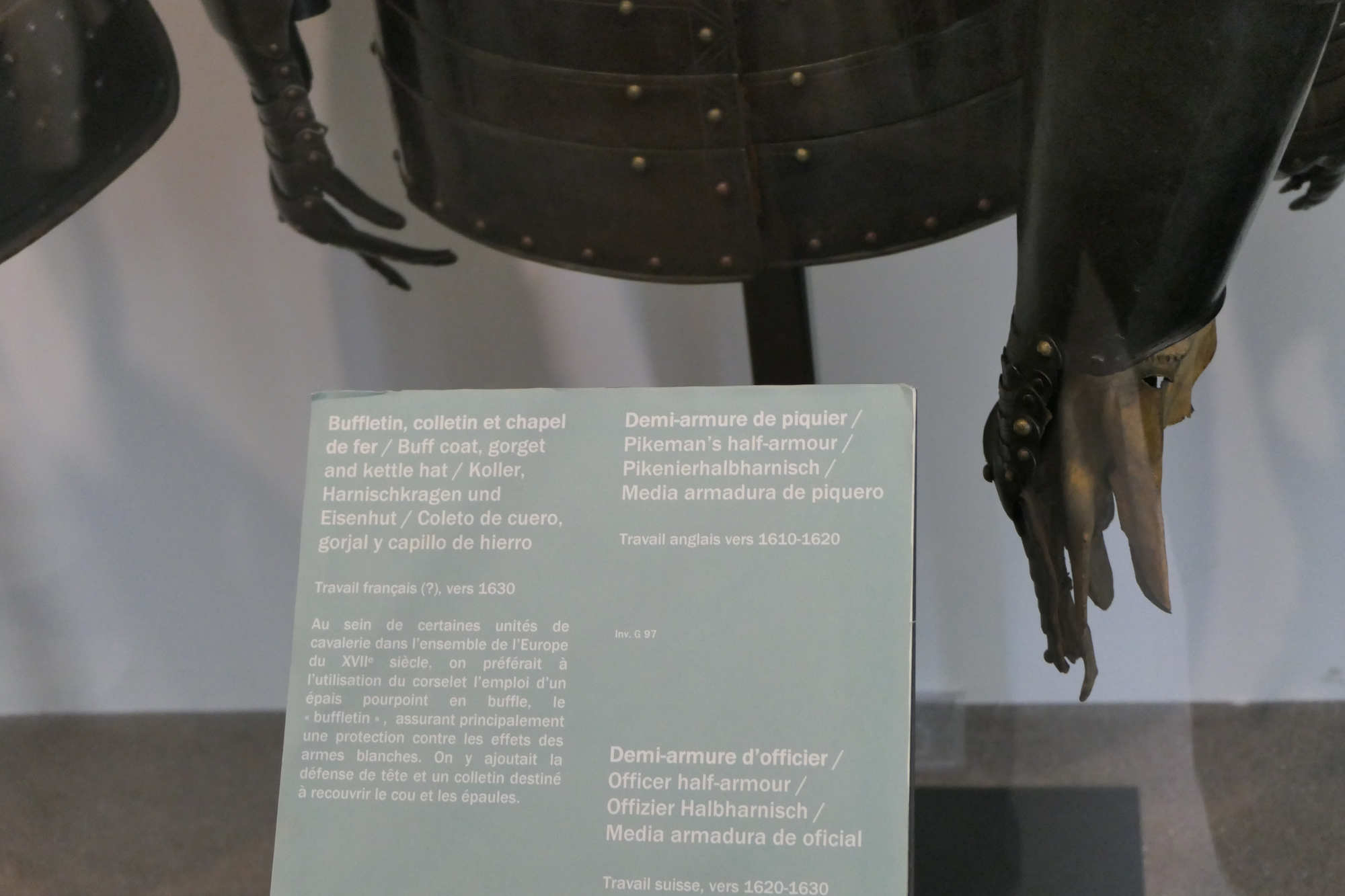 Les inventaires et ordonnances décrivent l’équipement (corselet/cuirasse, pot, pistolets), mais sans marques physiques permettant de reconnaître ensuite sur une pièce de musée qu’elle a appartenu à un mousquetaire plutôt qu’à un chevau?léger ou un gendarme. D ailleurs les armures conservés dans les musées (Invalides, Stockholm, Dresde, etc.) sont généralement classés comme « cuirasse de cavalier français, milieu XVII? siècle » ou « armure de la Maison du roi », sans mention certaine des mousquetaires.