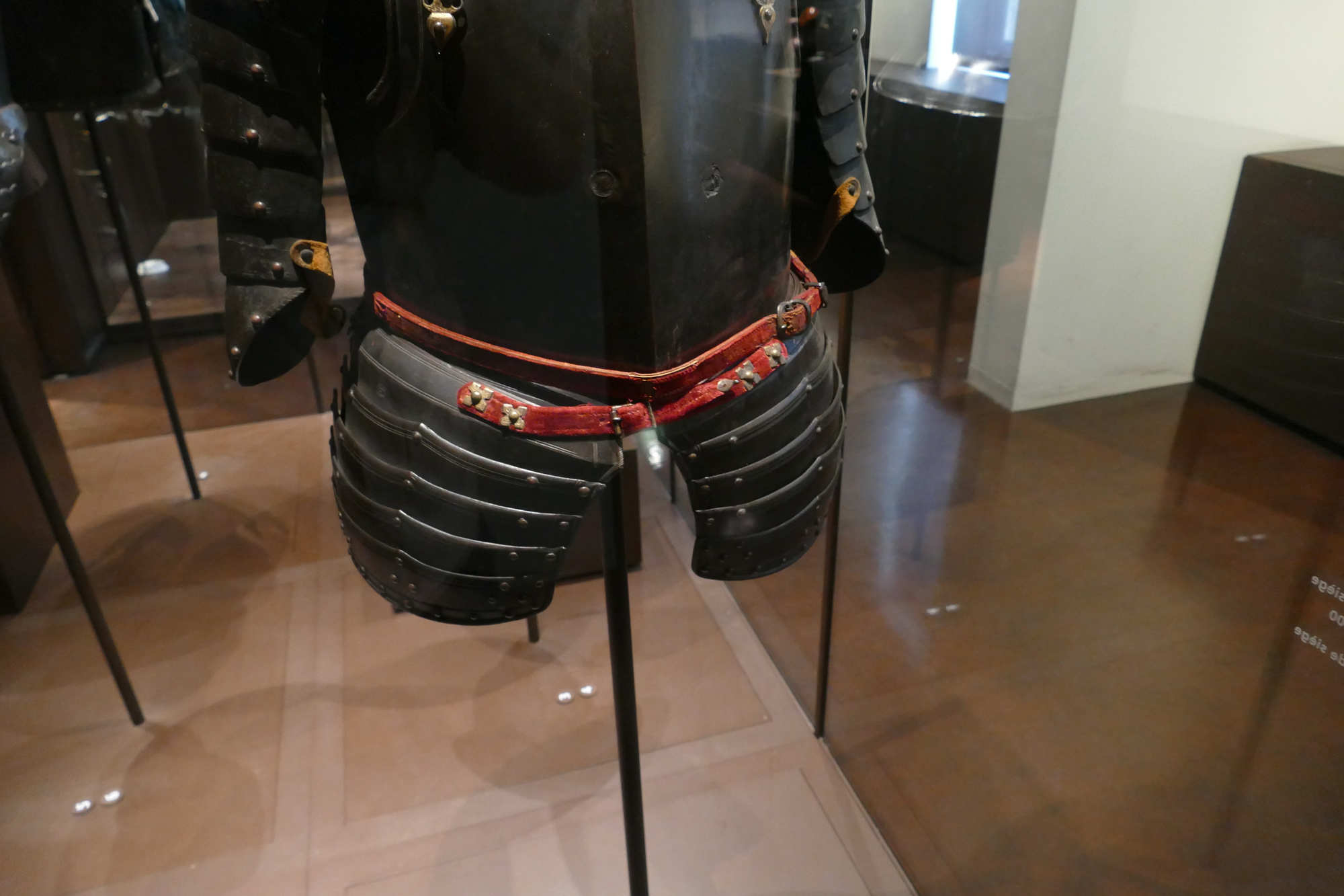Le décor des lames de tassettes, découpées en accolade soulignée de filets jumeaux (visuel 2), les emmanchures et le col (visuel 3) ornés d'un ourlet guilloché font preuve d'une réalisation soignée. Le décor des bretelles (visuel 4) est proche de celui de certaines armures royales de la première partie du XVIIe siècle.