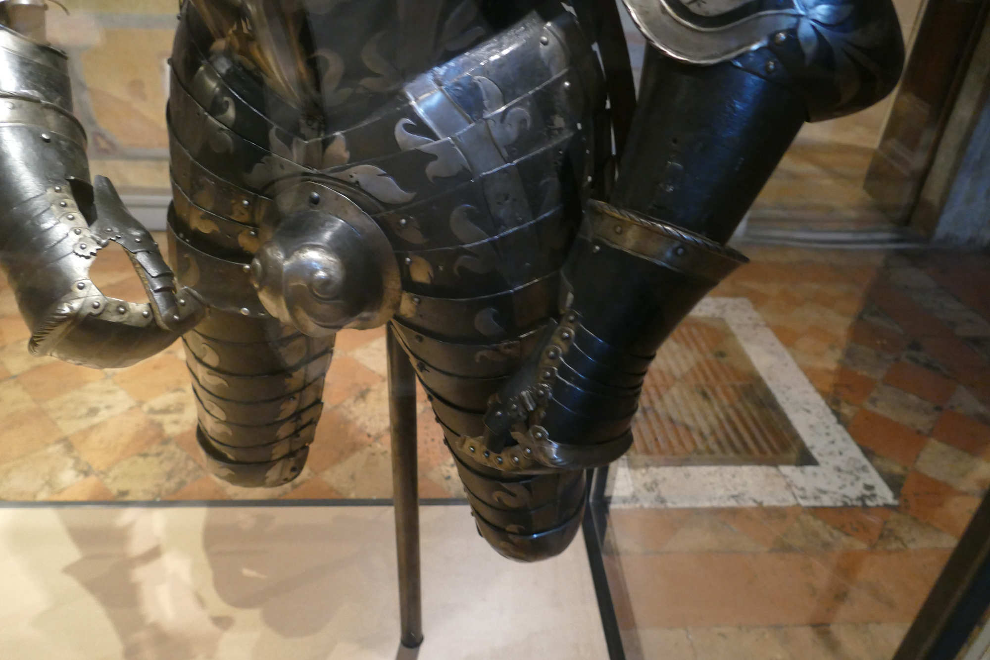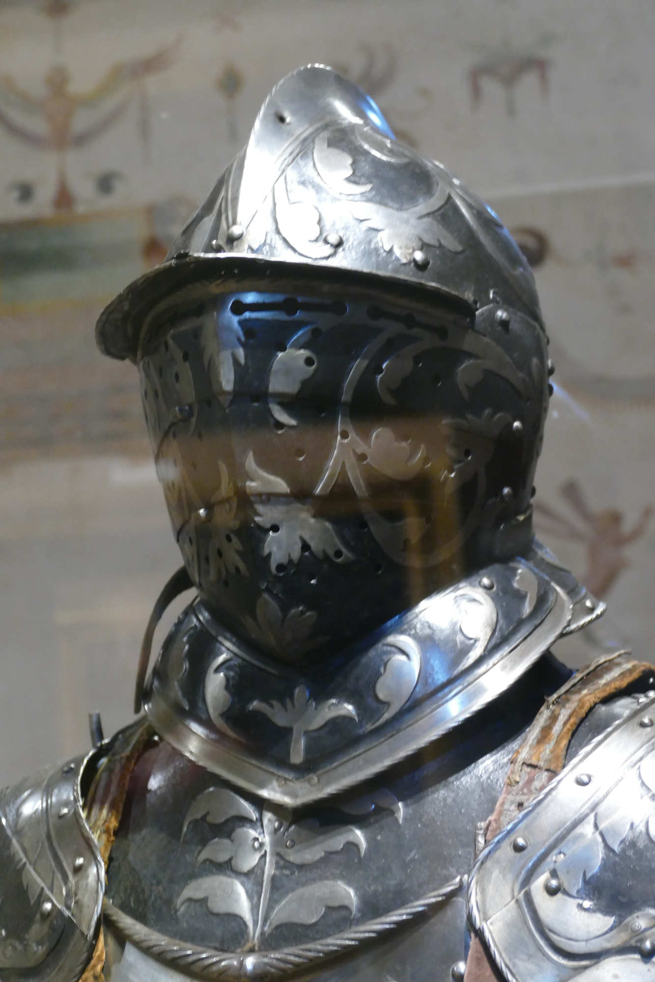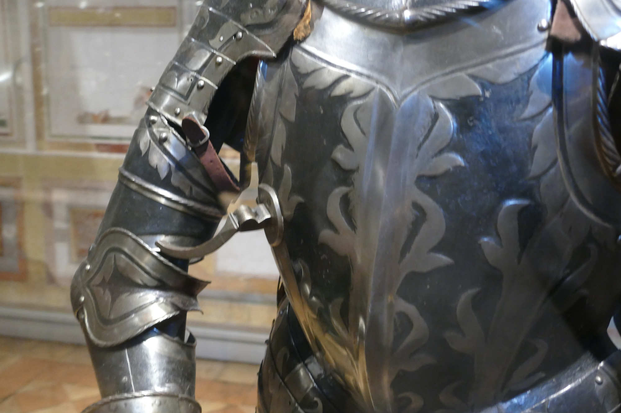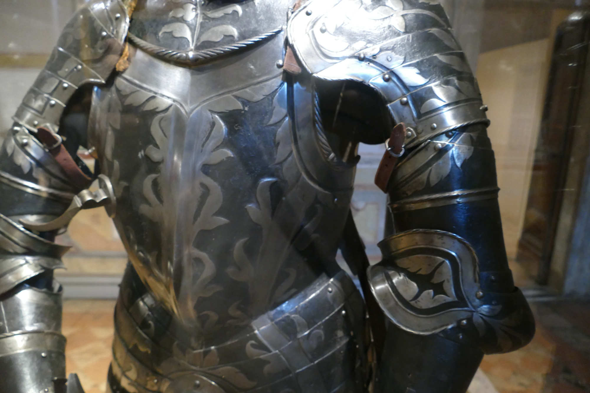 Cet ensemble d'un poids de 8.5 kgs se compose d'un torse côtelé, d'une gorgerette, d'épaulières et de brassards. Les surfaces sont ornées de volutes et de feuillages gravés et dorés sur un fond bruni. Le canon sur l'avant-bras gauche est un ajout.