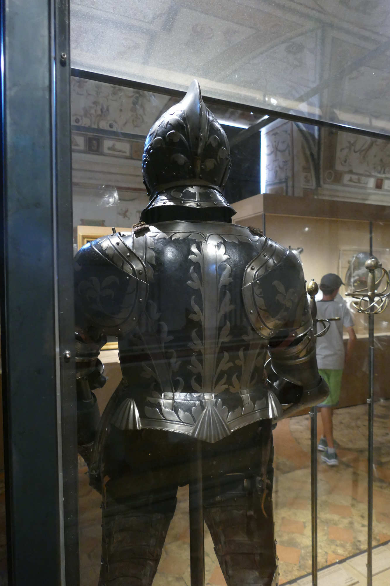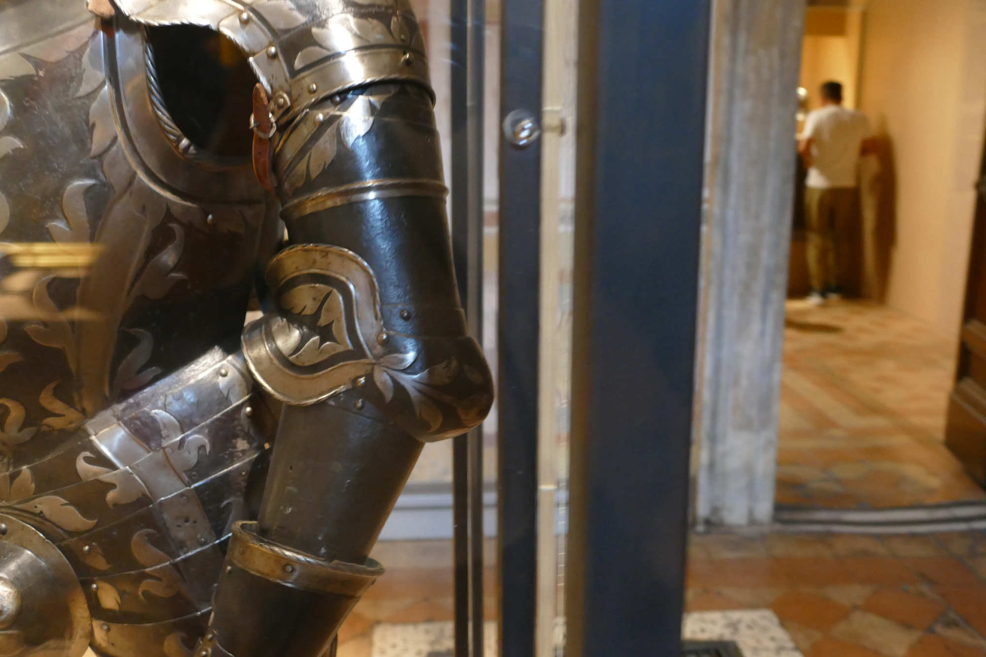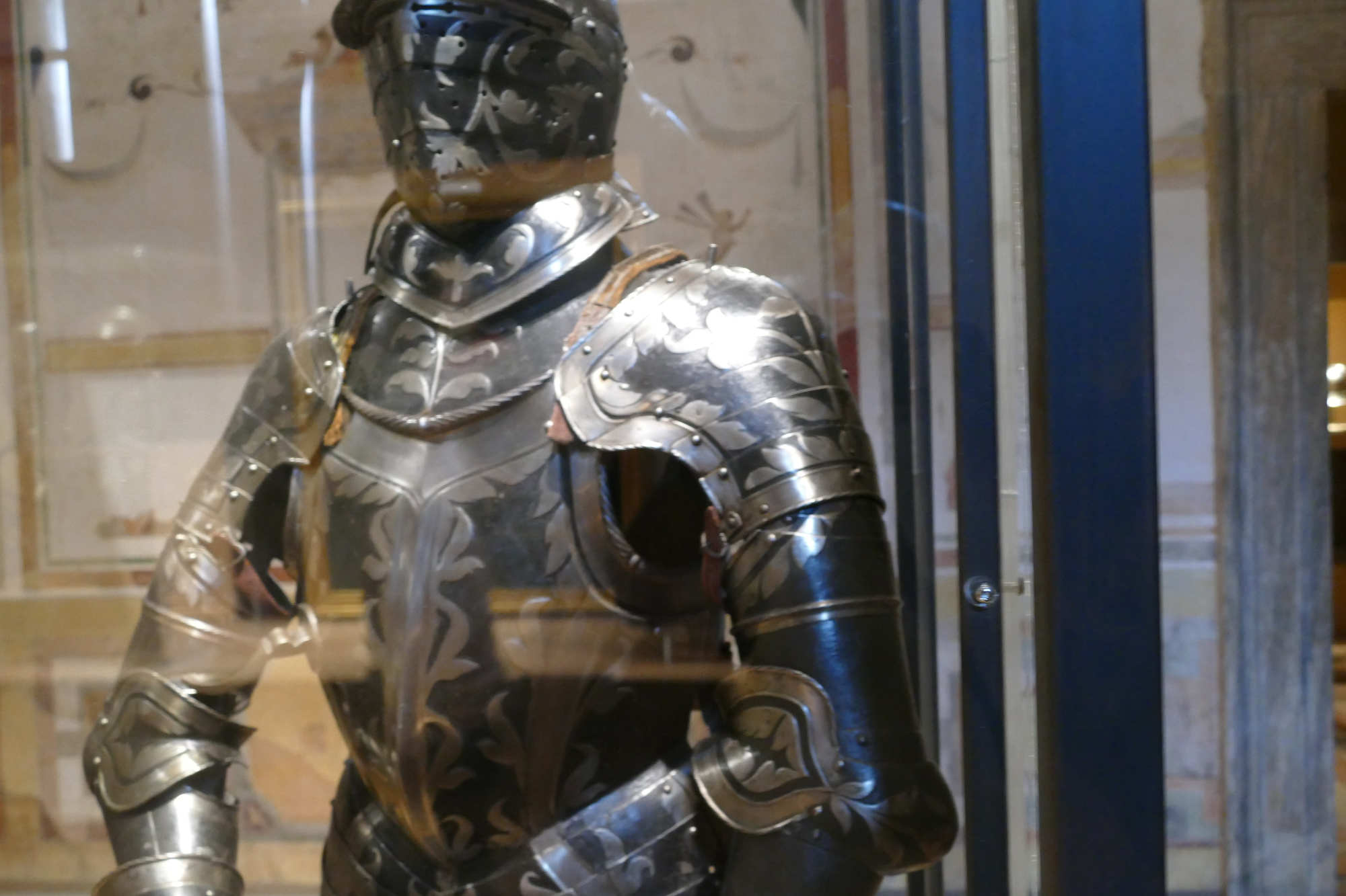 Cet ensemble d'un poids de 8.5 kgs se compose d'un torse côtelé, d'une gorgerette, d'épaulières et de brassards. Les surfaces sont ornées de volutes et de feuillages gravés et dorés sur un fond bruni. Le canon sur l'avant-bras gauche est un ajout.