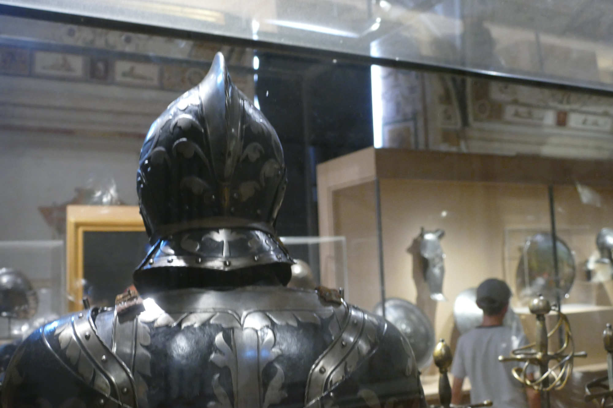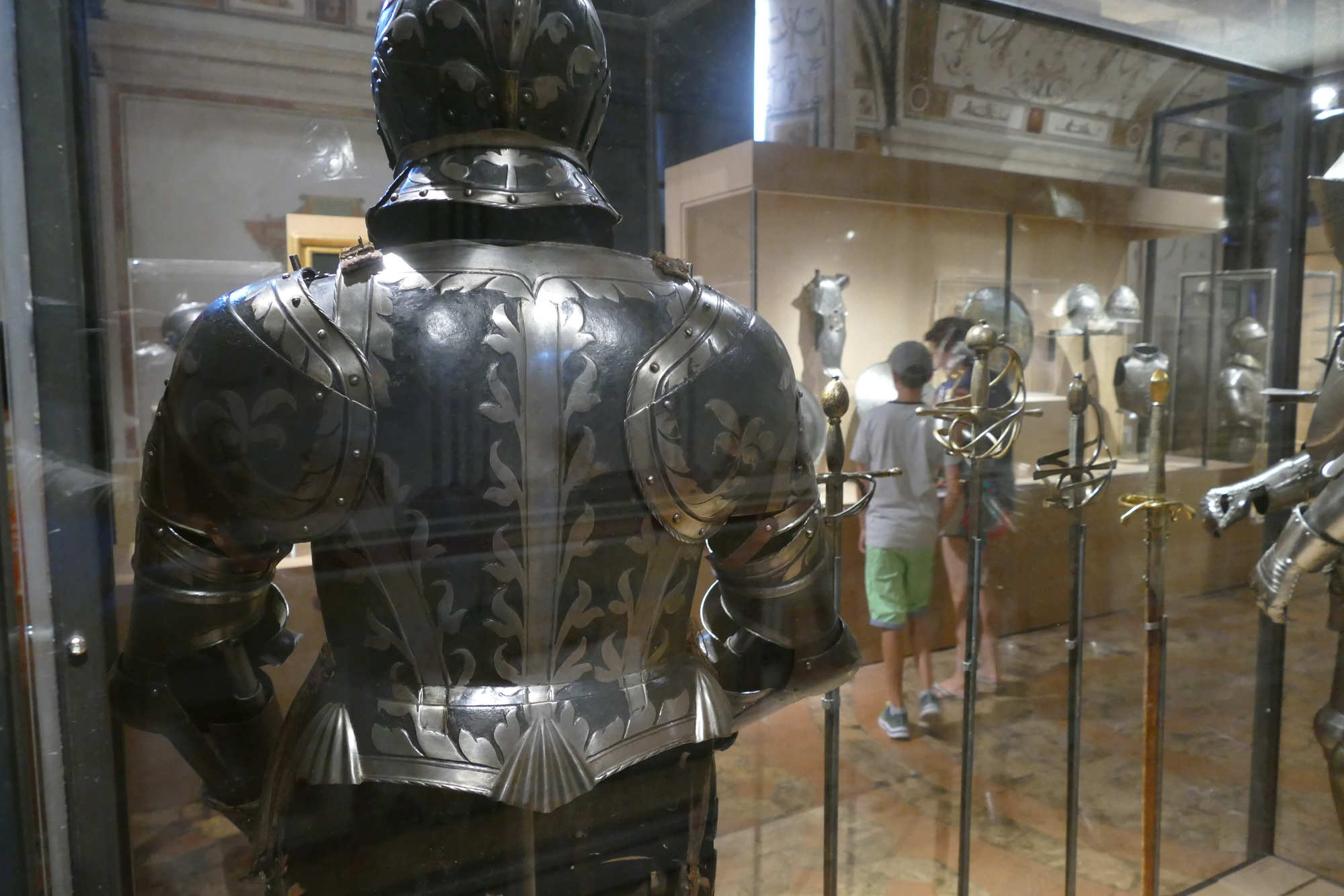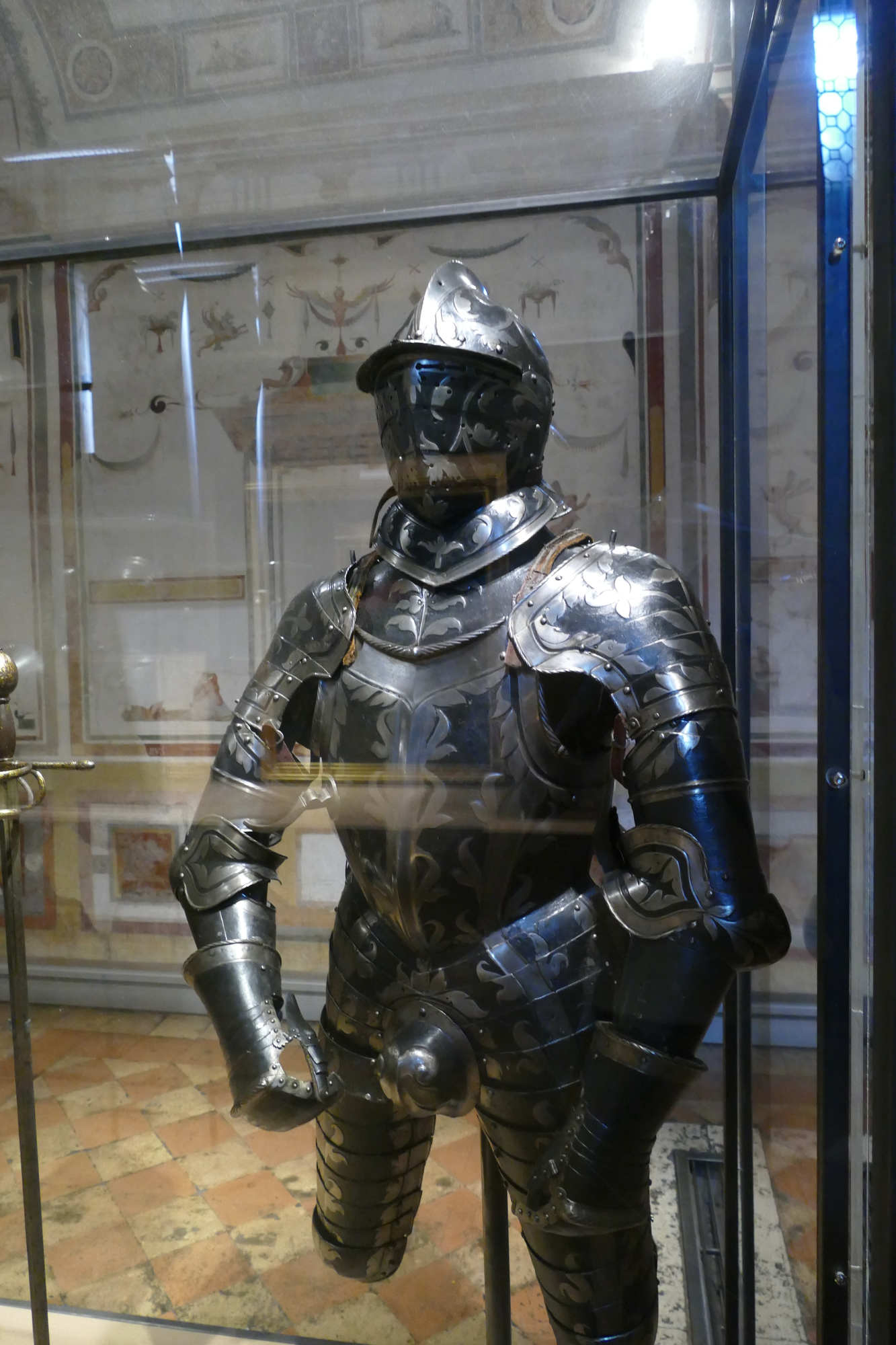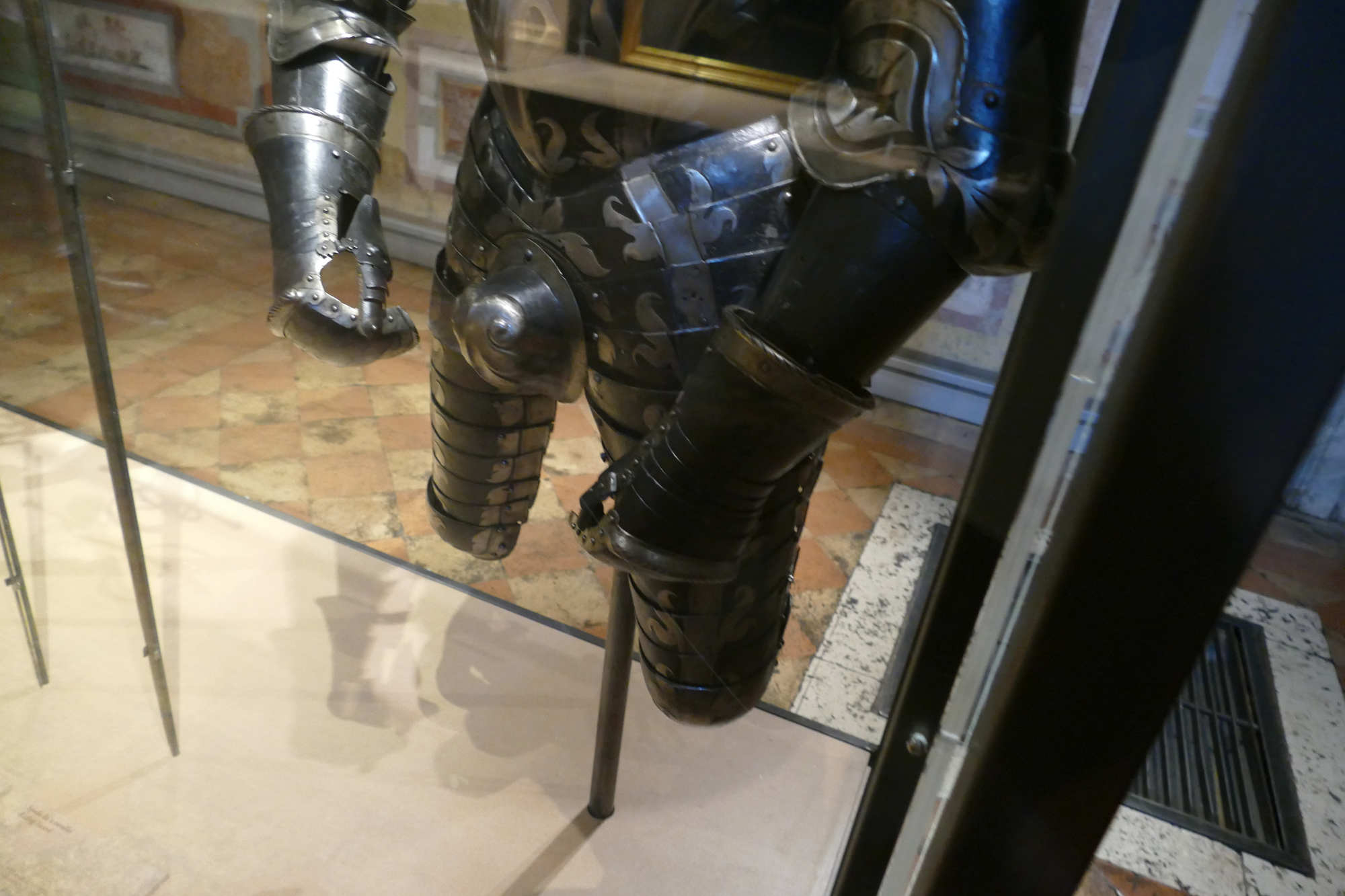 Cet ensemble d'un poids de 8.5 kgs se compose d'un torse côtelé, d'une gorgerette, d'épaulières et de brassards. Les surfaces sont ornées de volutes et de feuillages gravés et dorés sur un fond bruni. Le canon sur l'avant-bras gauche est un ajout.