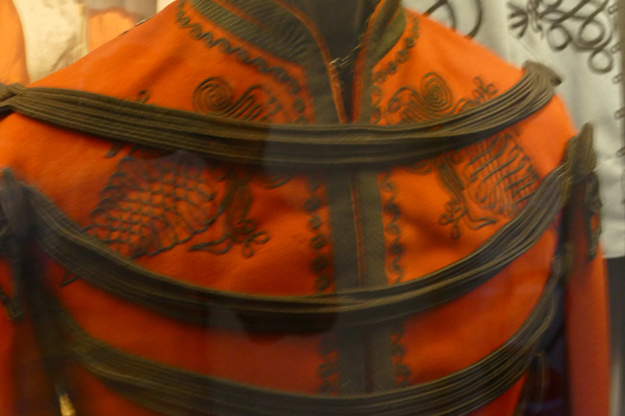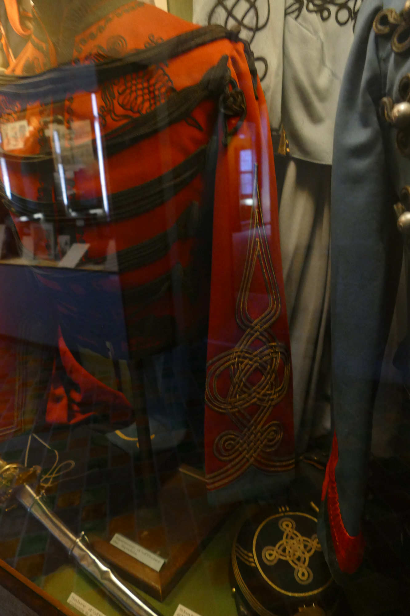 Caractéristiques Le spencer était un vêtement ajusté et cintré en laine garance (rouge garance foncé), orné de broderies dorées raffinées représentant des arabesques, des motifs géométriques et des brandebourgs le long du col, des poignets et du devant. I