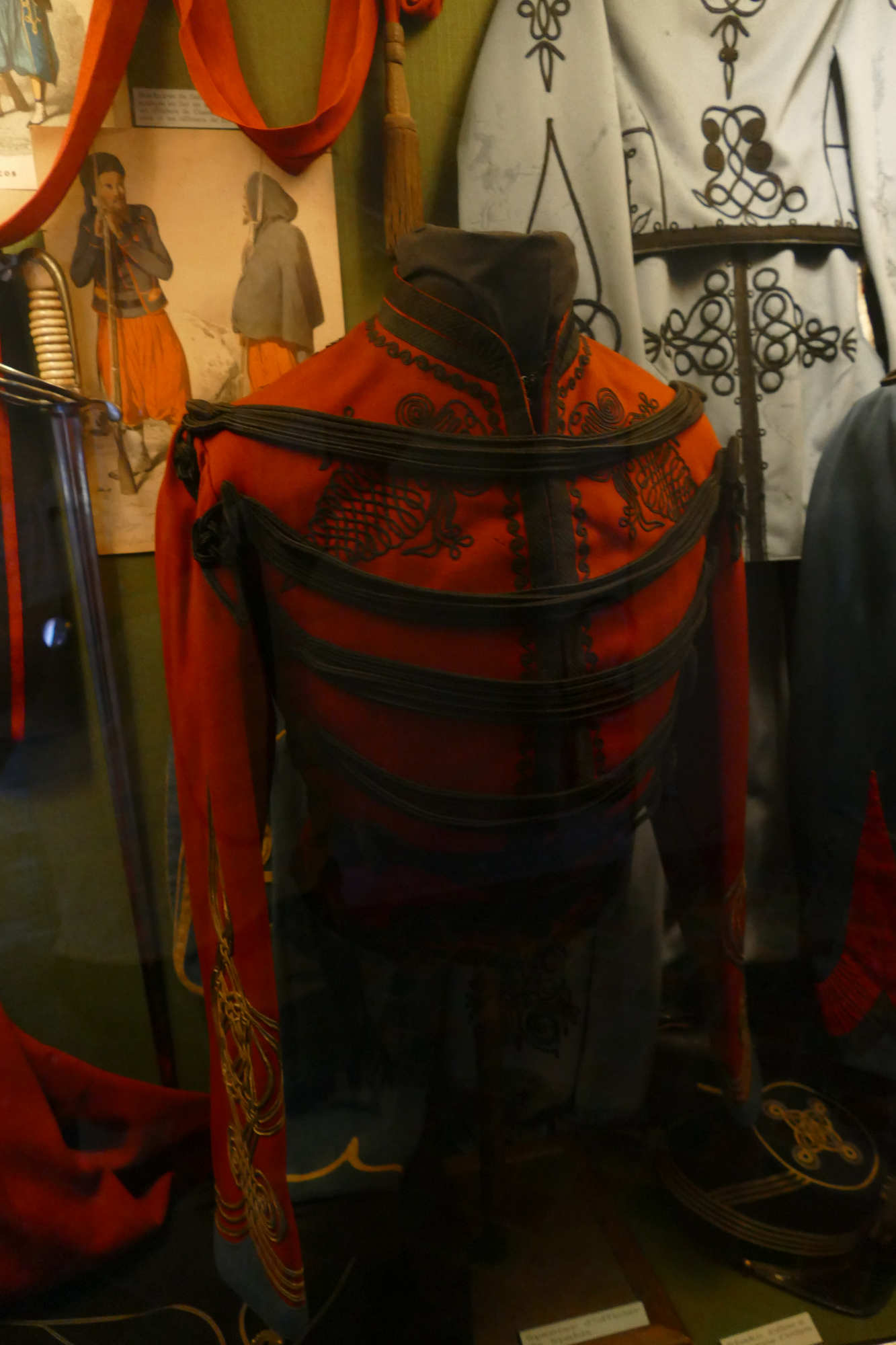 Spencer de capitaine de spahis des troupes d'Afrique second Empire. Il est orné de sept brandebourgs noirs sur un fond garance. Un galon de couleur noire sur le pourtour du spencer et dans le dos. Soutaches de deux couleurs, noire et olive. Le grade de capitaine est sur les manches. Les parements des manches sont de couleur bleu.
