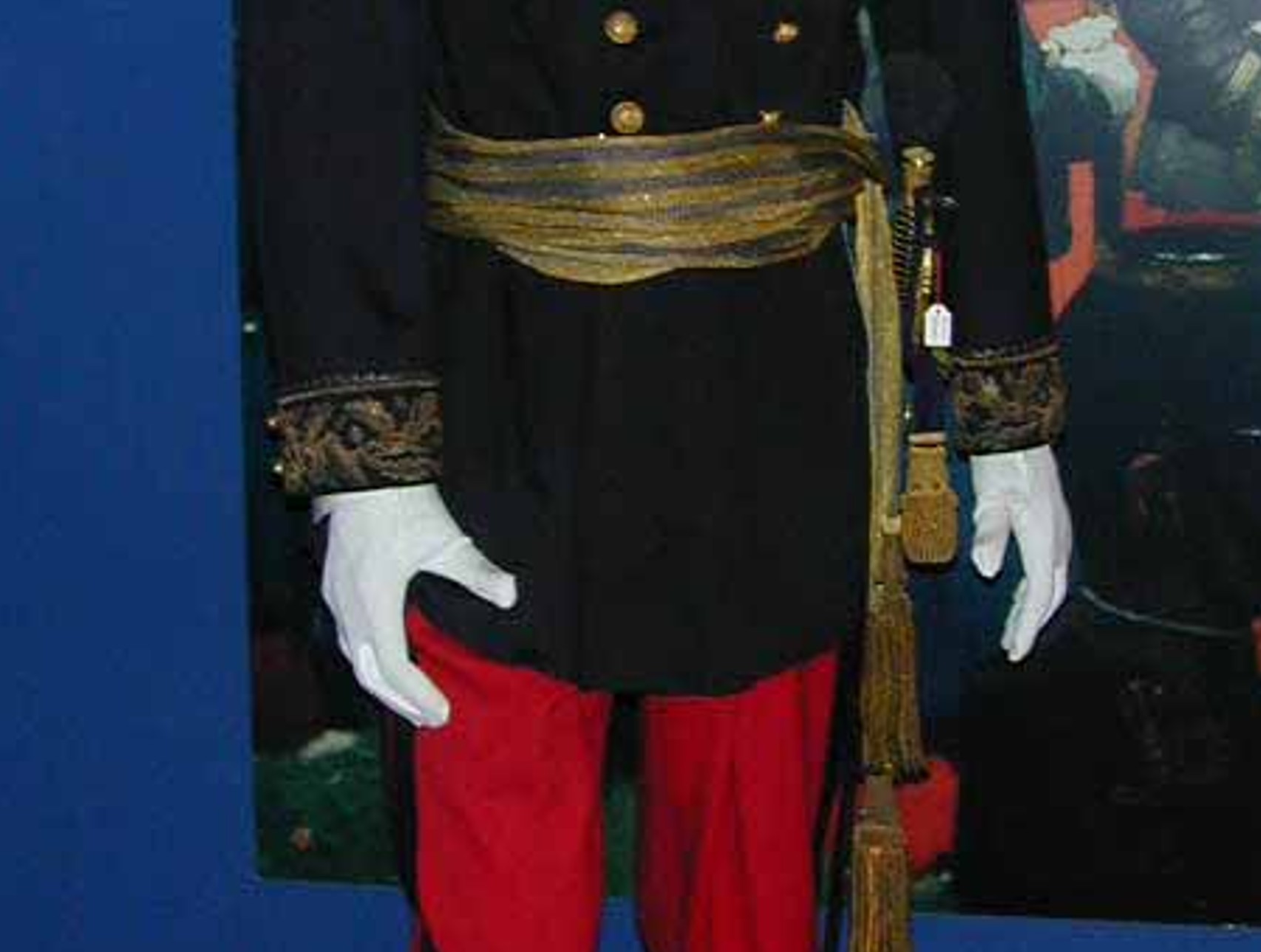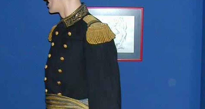 C 'est une tunique modèle en drap de satin bleu foncé presque noir, fermé sur la poitrine par une rangée de neuf gros boutons d'uniforme.