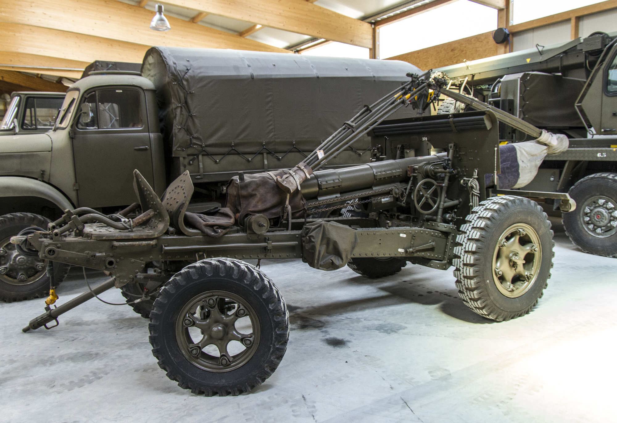 Suisse : Affût à roues pleines/pneumatiques pour traction par camion Saurer, recul hydraulique variable, débattement horizontal de 53°/-788‰, élévation de -6°/+45° ; optimisé pour la neutralité suisse, avec une priorité donnée à la mobilité en montagne.