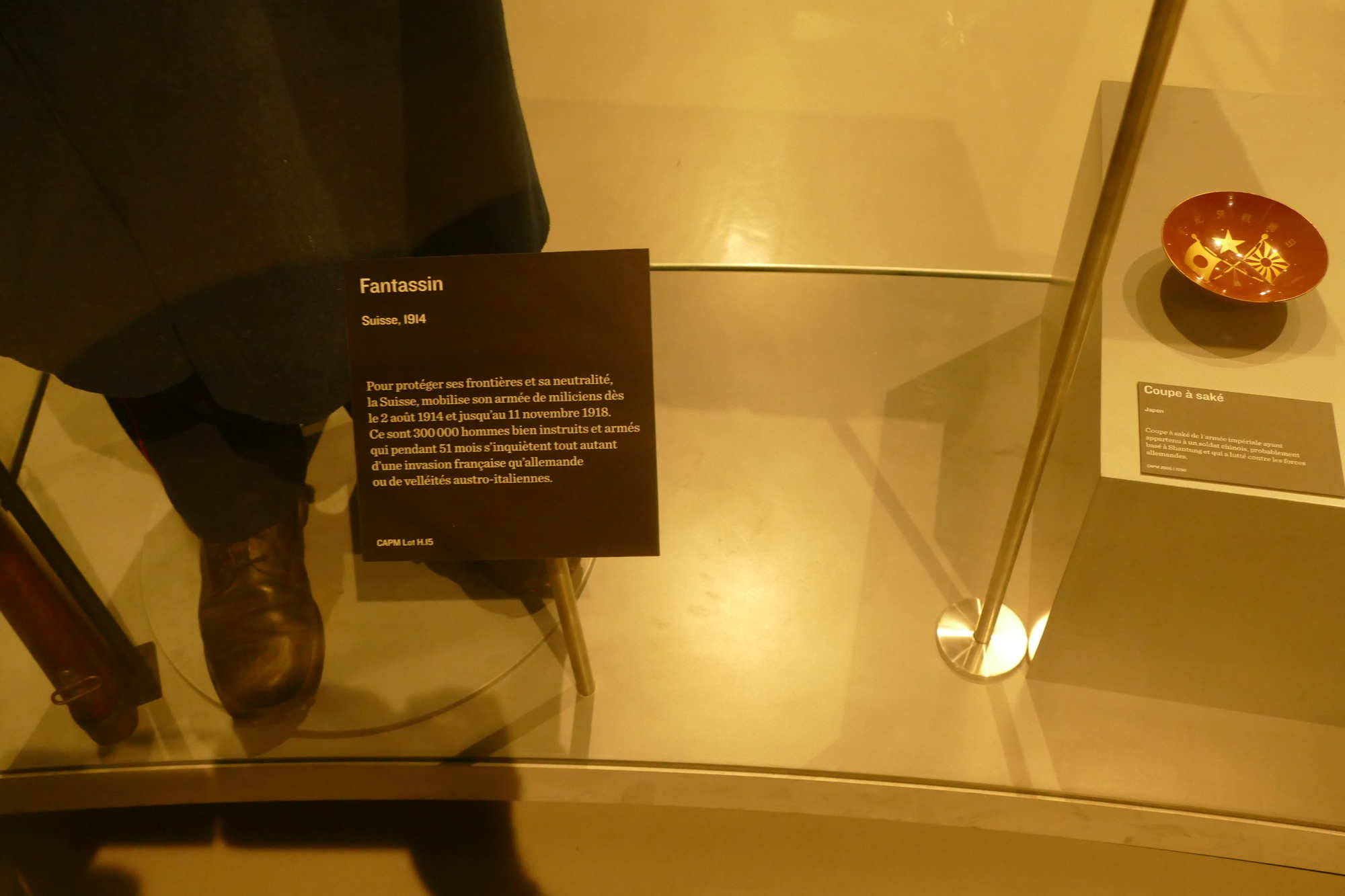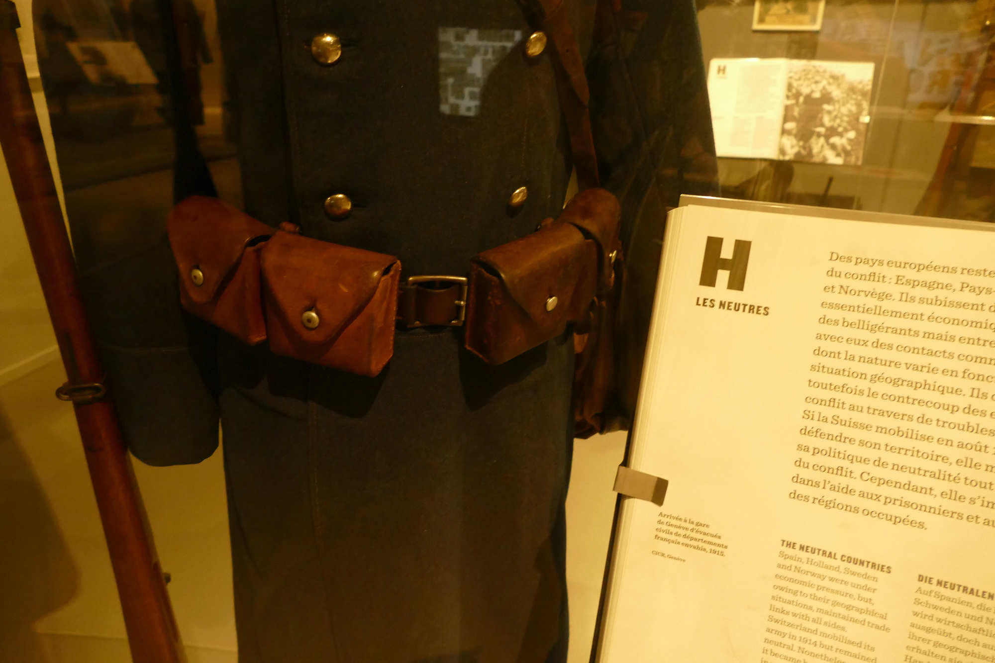 En 1914, l'infanterie suisse portait un uniforme de transition vers le gris-vert (feldgrau), adopté progressivement dès 1907-1912 pour des raisons de camouflage, remplaçant les tenues bleu foncé ou rouges du XIXe siècle. Au début de la mobilisation, beaucoup arboraient encore le sarrau gris long (manteau ample) sur la tenue de tous les jours, complété par un bonnet de police souple. Éléments Clés Veste/Tunique : Modèle M1912 gris-vert en drap de laine, à col droit, 6 boutons peints mats, poches fendues ; parements bleus pour officiers. Transition complète vers feldgrau en octobre 1915. Pantalon : Droit ou montante, gris-vert renforcé aux genoux, avec guêtres en toile ou bandes molletières ; bottes cloutées noires.? Coiffure : Bonnet de police (Tschako modèle 1911) gris-vert à visière souple, cocarde suisse ; tests de casques en acier dès 1918 seulement.?Couvertures : Manteau long gris (sarrau) pour pluie/neige alpine, cape optionnelle ; écharpe et gants en laine.?