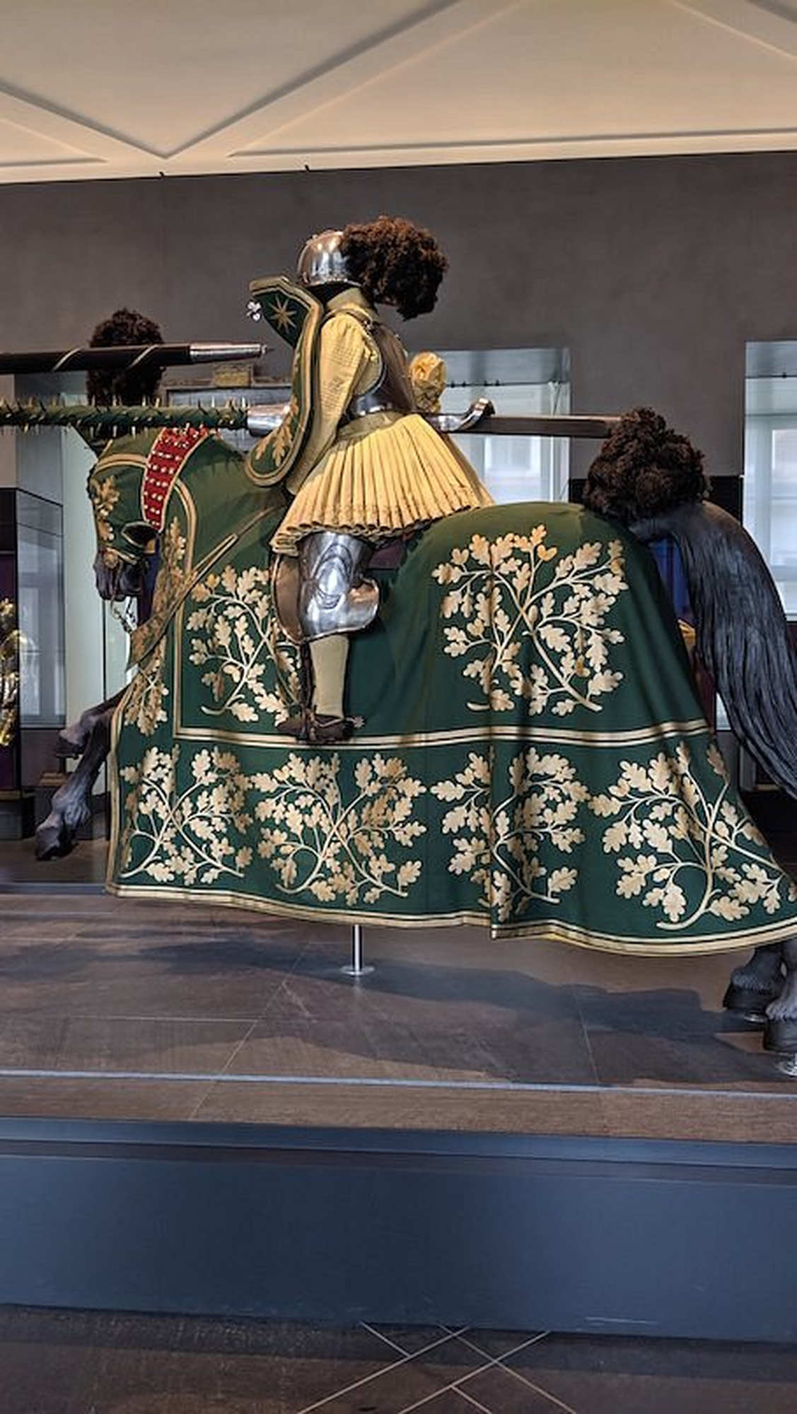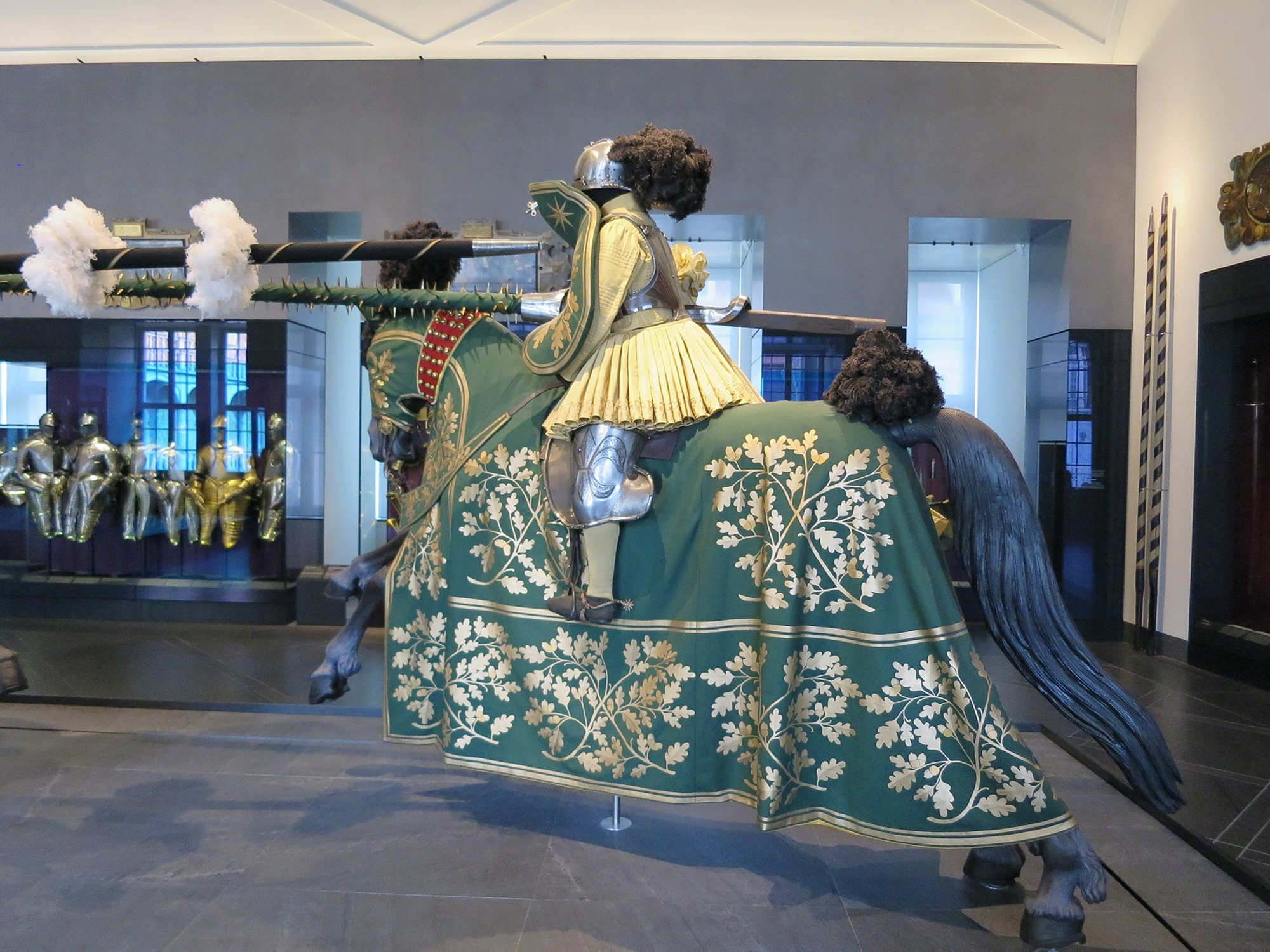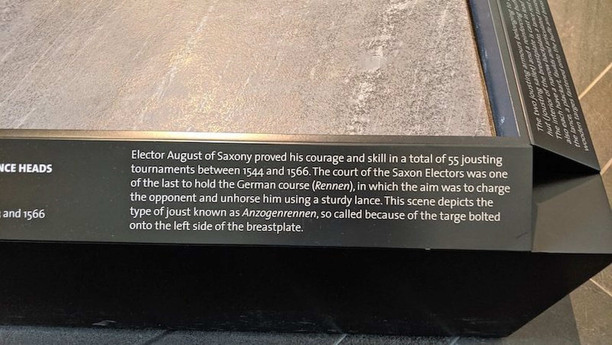 Dans les tournois équestres de la fin du Moyen Âge, outre les joutes existait une seconde le Rennen Celle-ci mettait en valeur l’habileté équestre et la précision du maniement de la lance. qui mesurait environ trois à quatre mètres de long et, avec ses accessoires – notamment la pointe et la plaque de talon –, pouvait peser jusqu’à 15 kg.