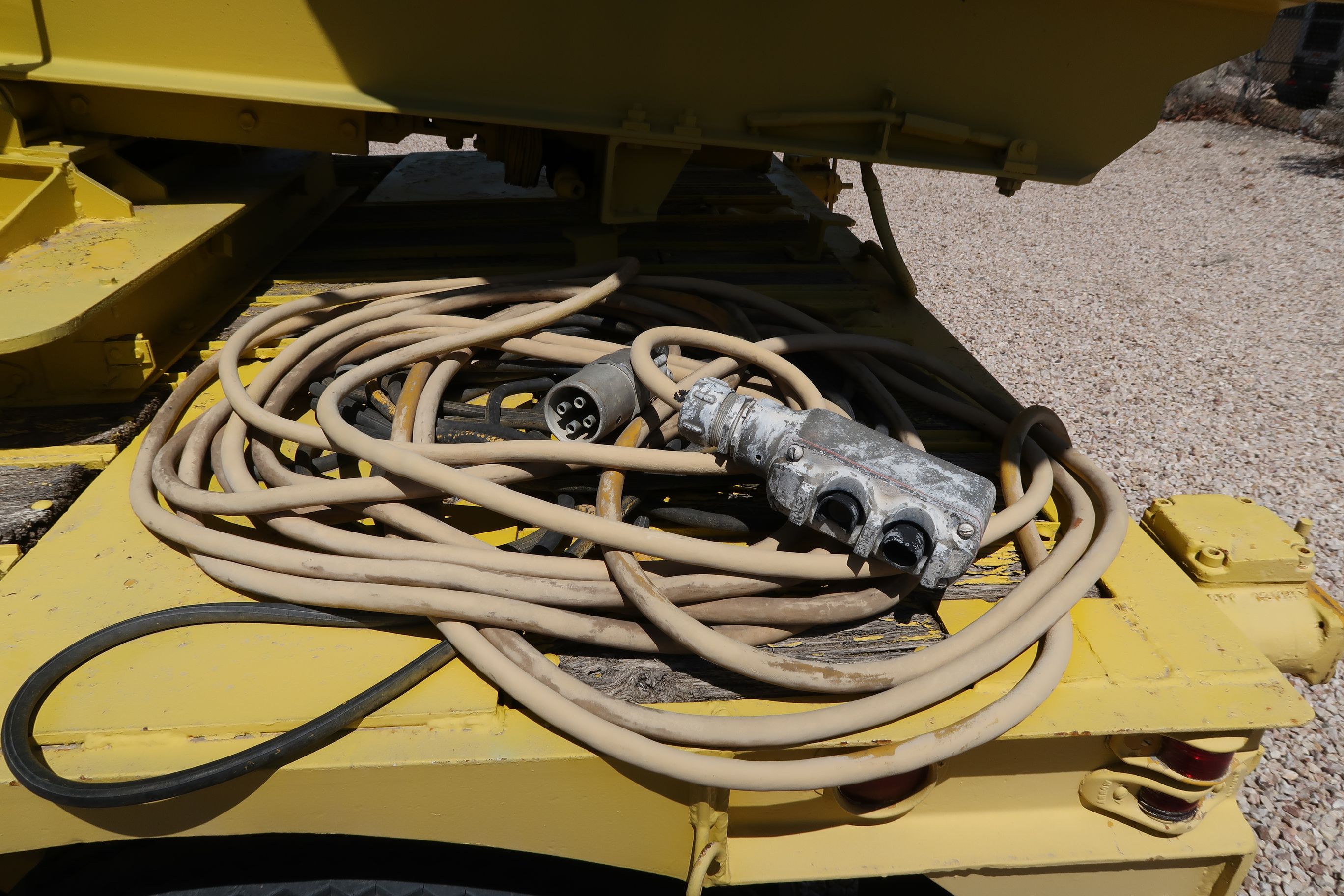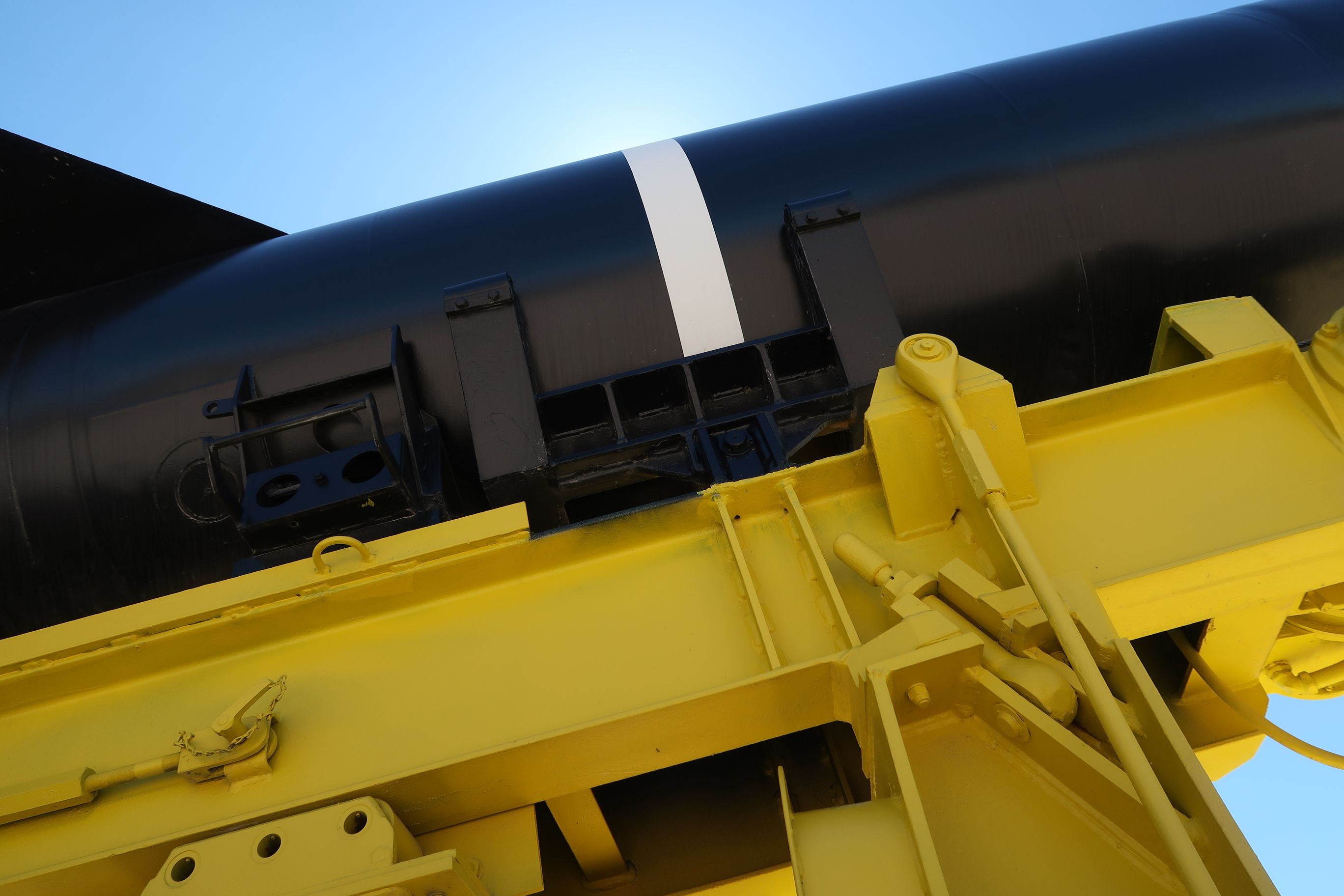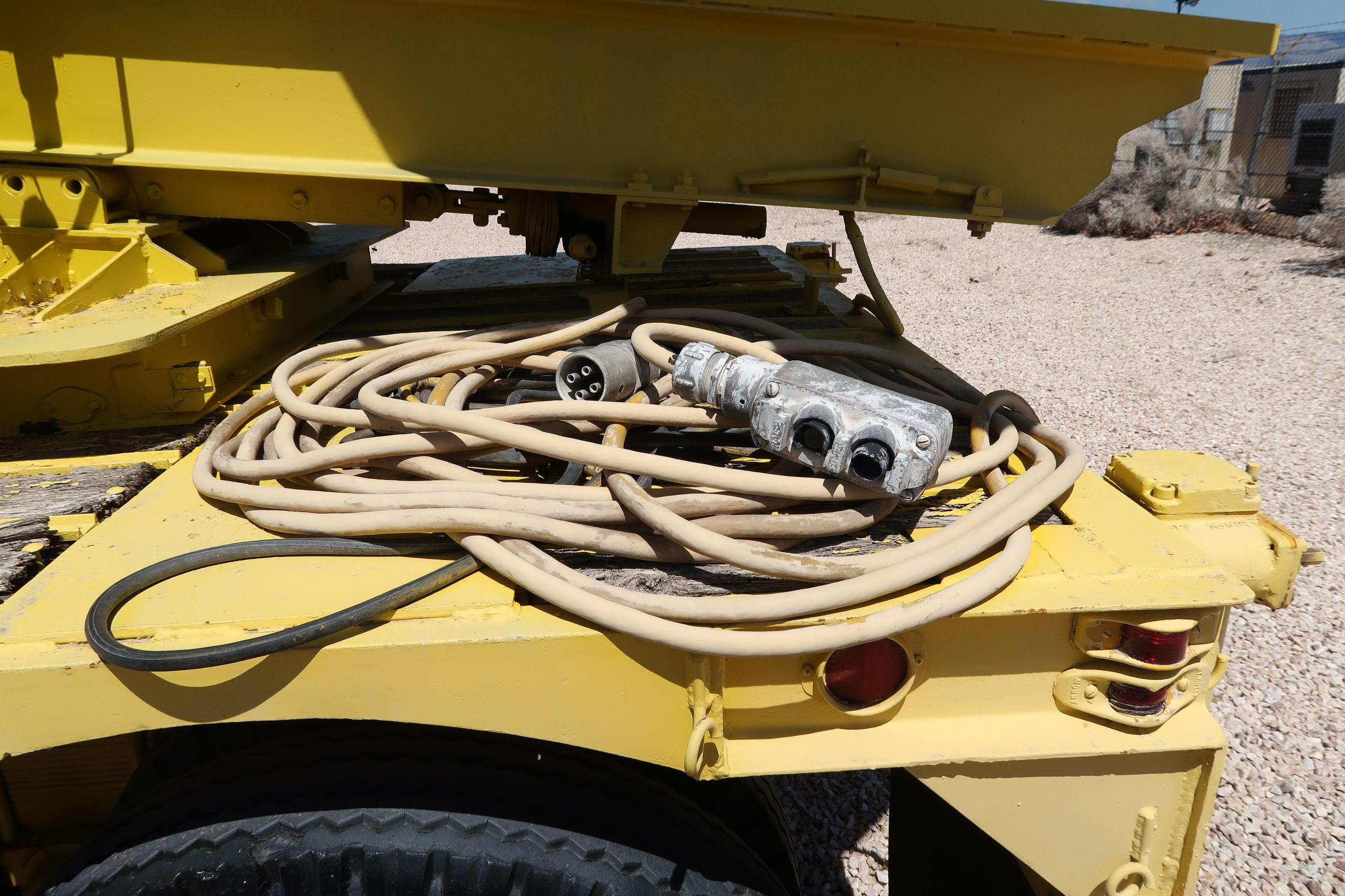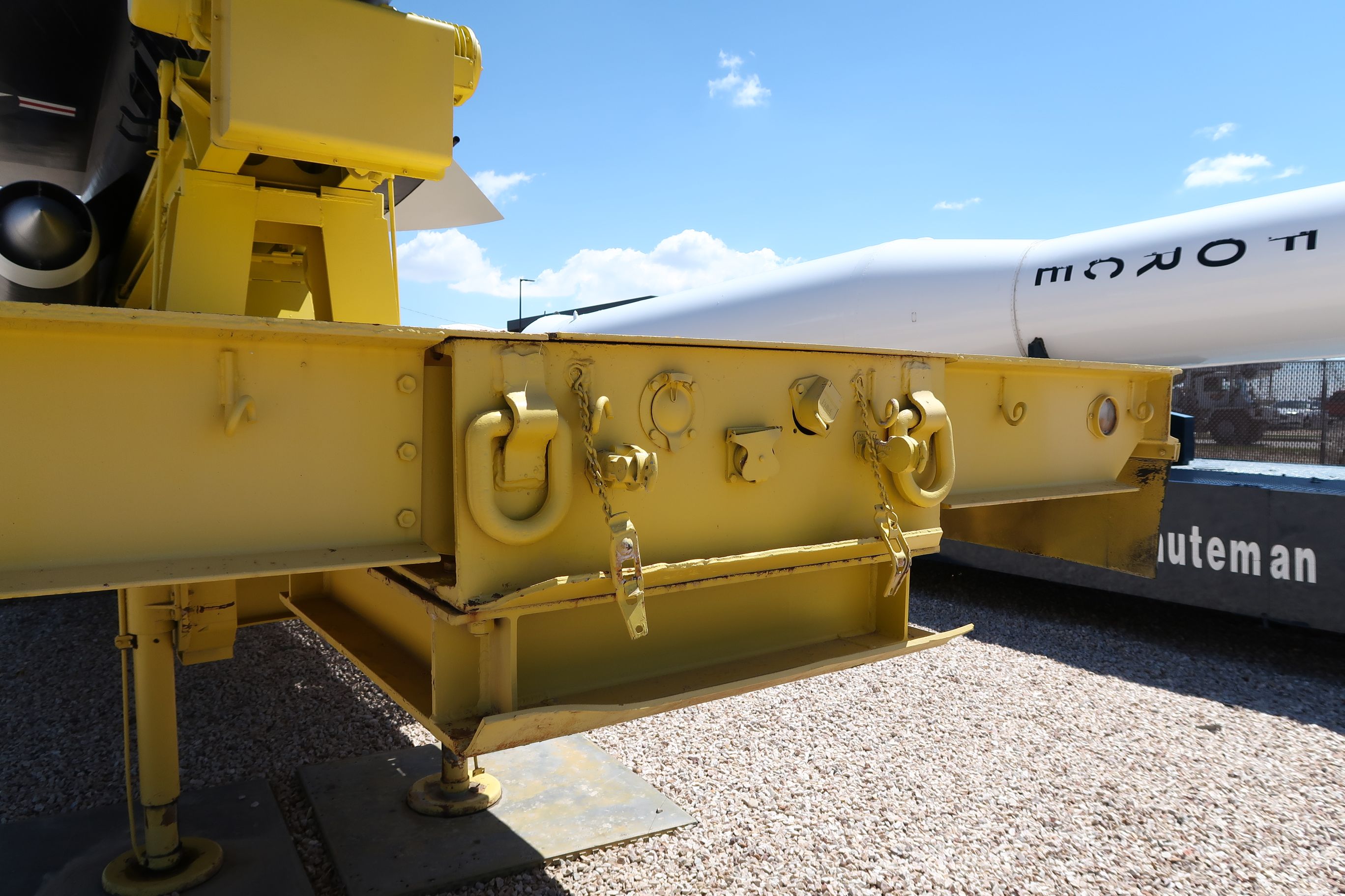 - Type : Semi-remorque à plat à profil bas à double essieu (ou à l'essieu tandem) avec un support hydraulique ou mécanique de berceau/railleur de lanceur. La peinture jaune, le cadre résistant, les roues doubles par essieu et l'attelage du col de cygne sont typiques du surplus militaire américain ou des remorques d'équipement lourd adaptées aux musées du milieu du XXe siècle.