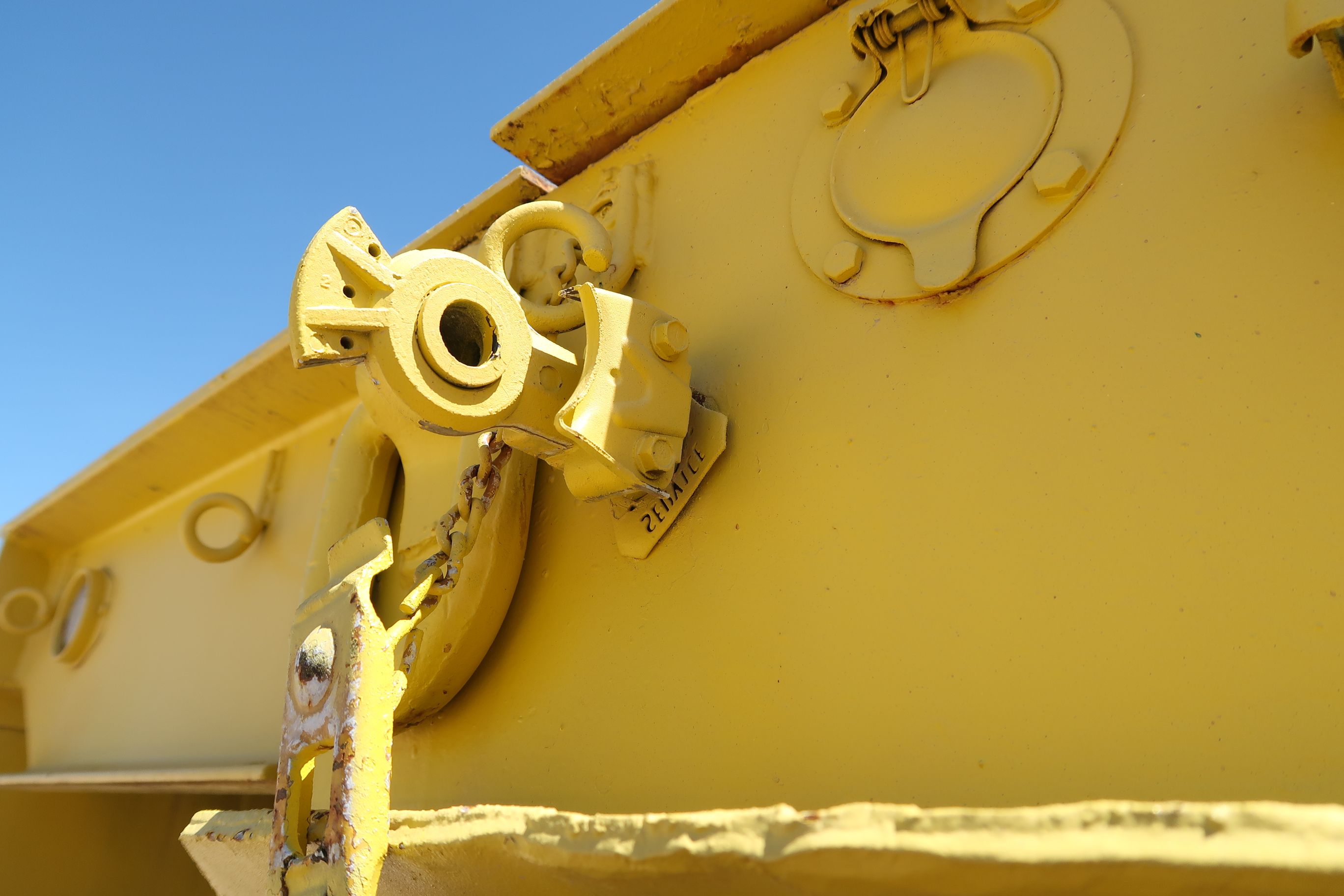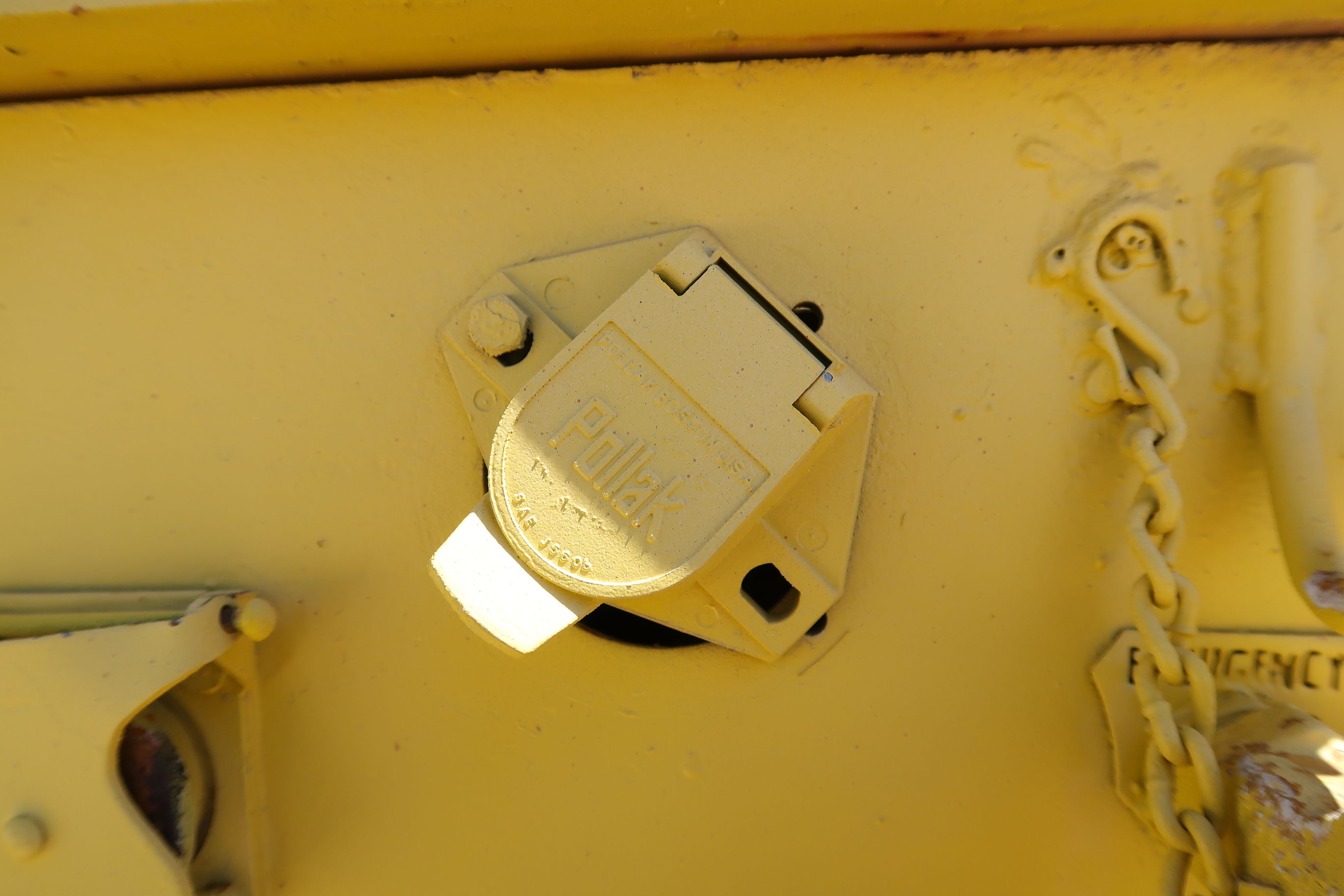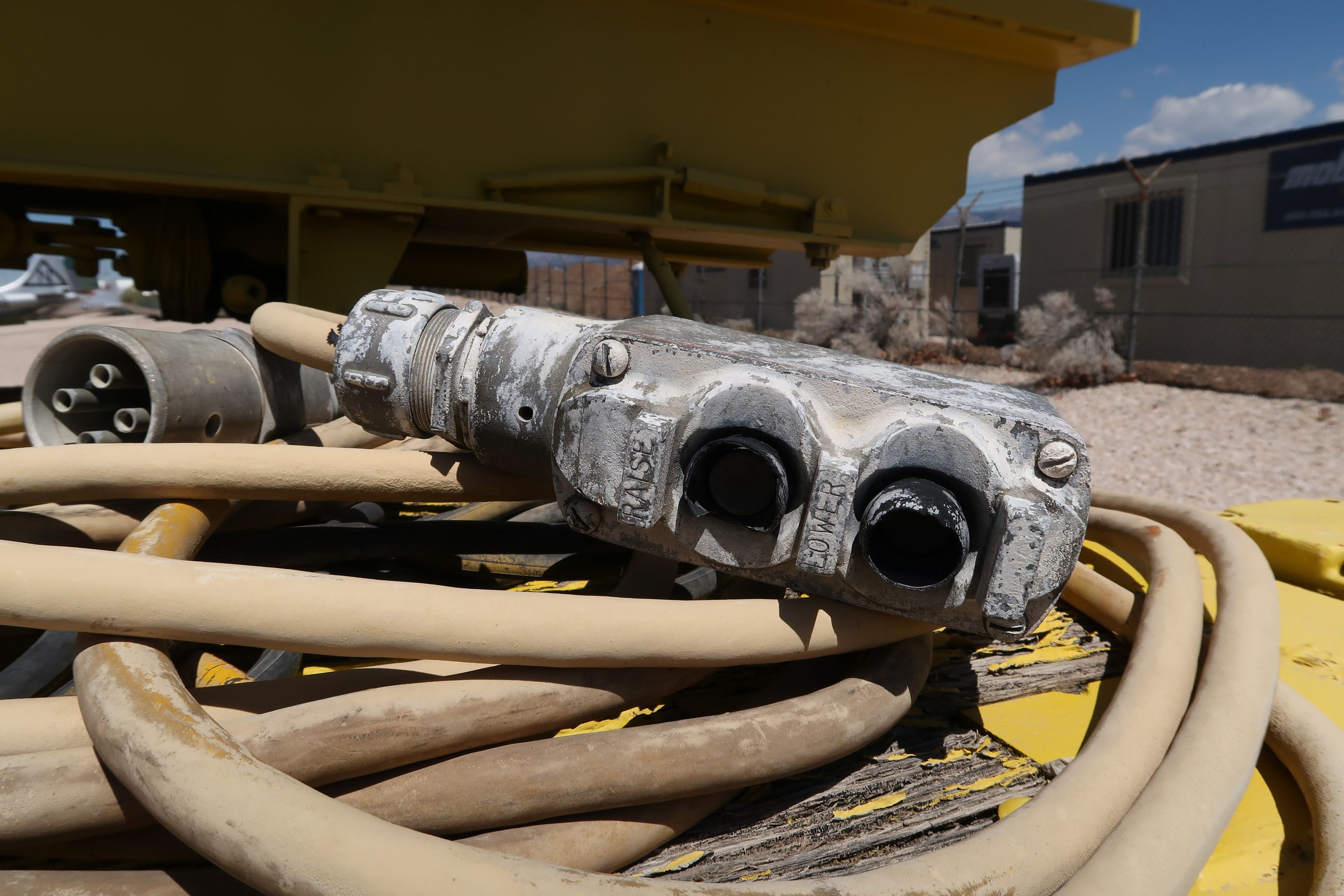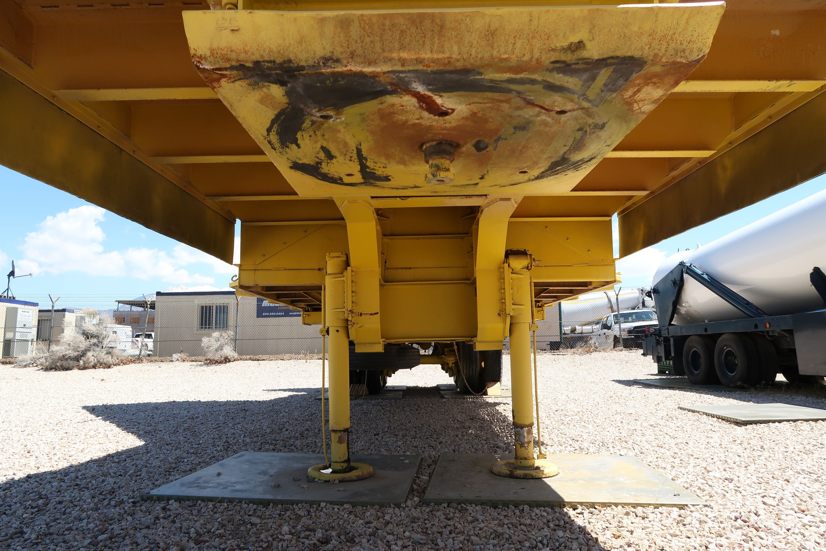 - Type : Semi-remorque à plat à profil bas à double essieu (ou à l'essieu tandem) avec un support hydraulique ou mécanique de berceau/railleur de lanceur. La peinture jaune, le cadre résistant, les roues doubles par essieu et l'attelage du col de cygne sont typiques du surplus militaire américain ou des remorques d'équipement lourd adaptées aux musées du milieu du XXe siècle.