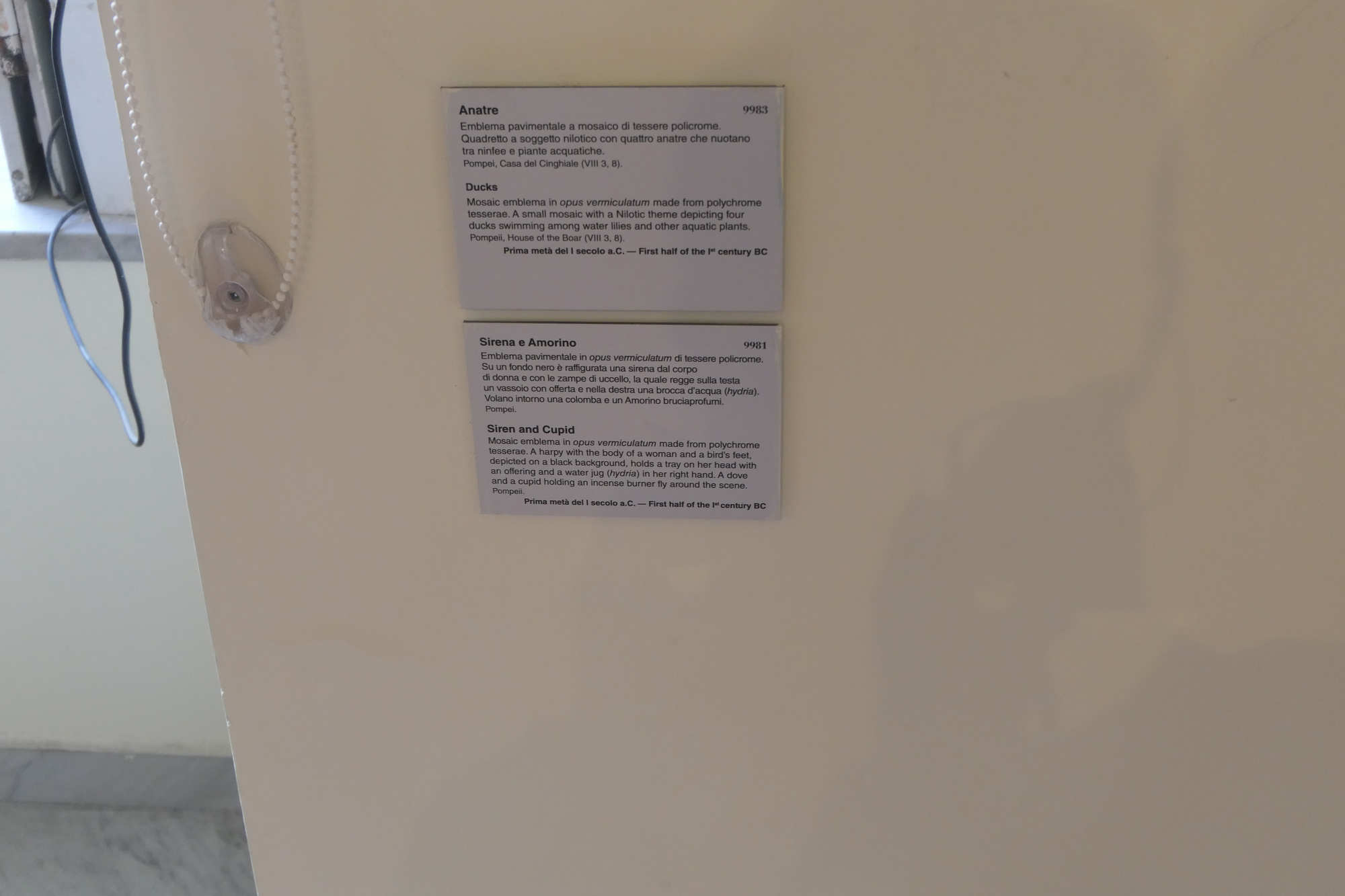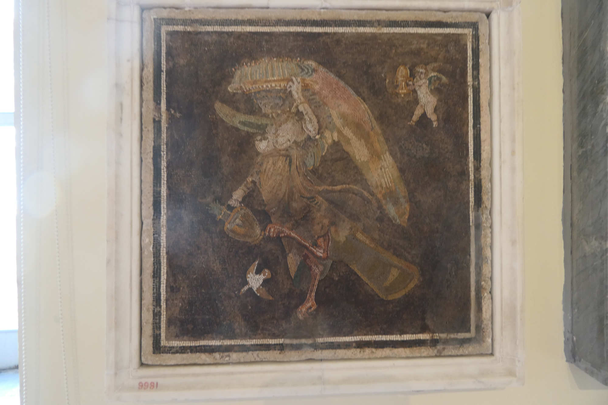 La mosaïque devait vraisemblablement orner le sol d'une salle de réception (triclinium) ou d'un tablinum d'une villa ou demeure aristocratique romaine d'époque hellénistique tardive ou républicaine (IIe–Ier siècle av. J.-C.). La mosaïque inv. 9981 est donc l'une de ces pièces dont l'origine exacte est perdue dans l'histoire des grandes collections de la Renaissance — un sort partagé par beaucoup d'autres trésors du MANN. Ce détail est fondamental : la sirène ici n'est pas la créature à queue de poisson que nous imaginons aujourd'hui c'est la sirène grecque antique, être hybride à corps et tête de femme, mais à ailes et pattes d'oiseau. C'est la créature de l'Odyssée, celle qui chante pour entraîner Ulysse vers la mort.