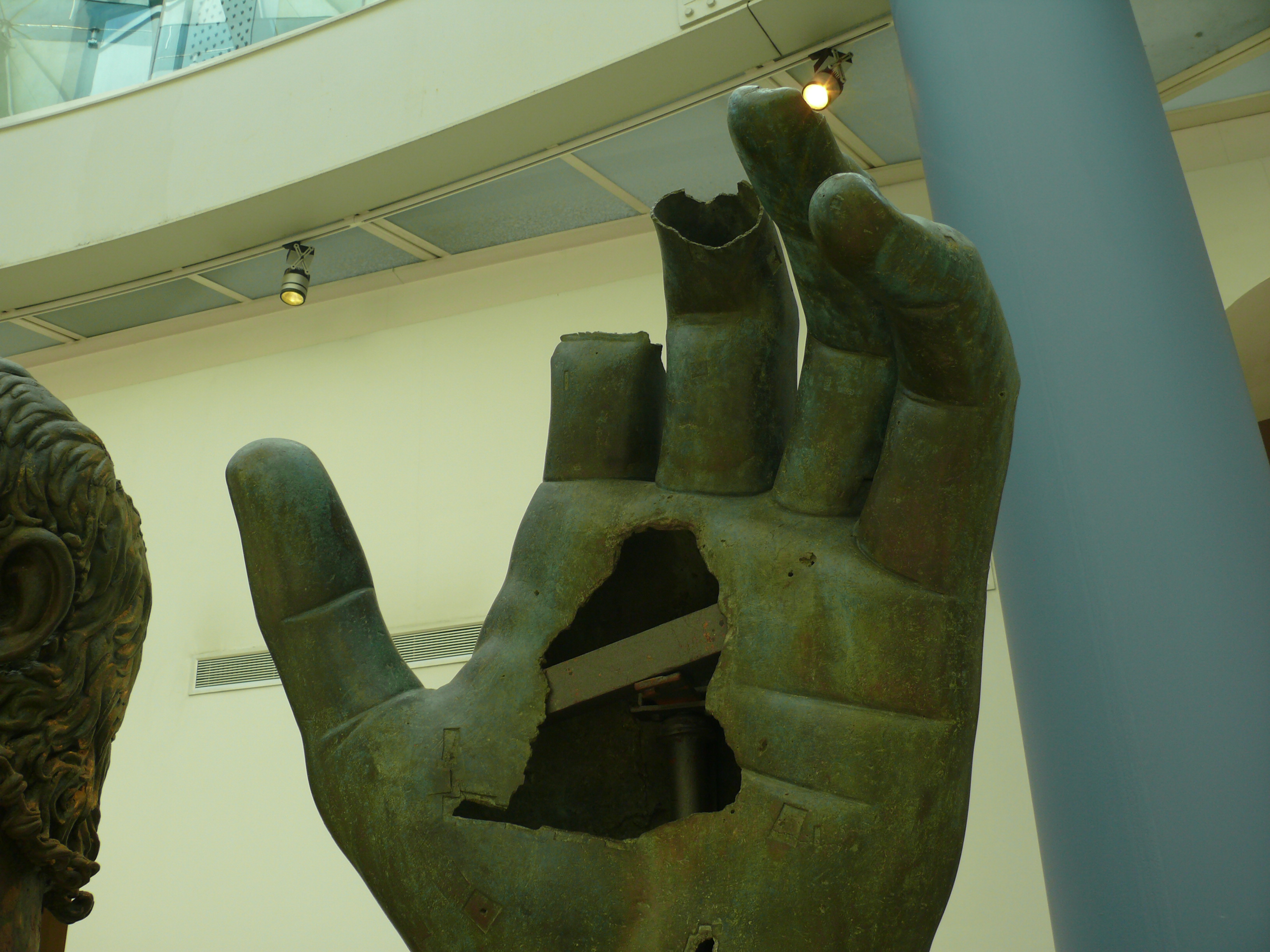 Comme le déclare le Surintendant Claudio Parisi Presicce, « Le doigt s’est vraisemblablement détaché au moment de la séparation de la main et du globe que celle-ci tenait à l’origine, en 1584, lorsque le globe a été placé au sommet de la colonne milliaire du Ier mille de la via Appia qui décorait la balustrade fermant la place du Capitole vers le Champ de Mars. Sur une gravure publiée en 1759 par l’abbé Diego Revillas, la main apparaît déjà sans son index. »