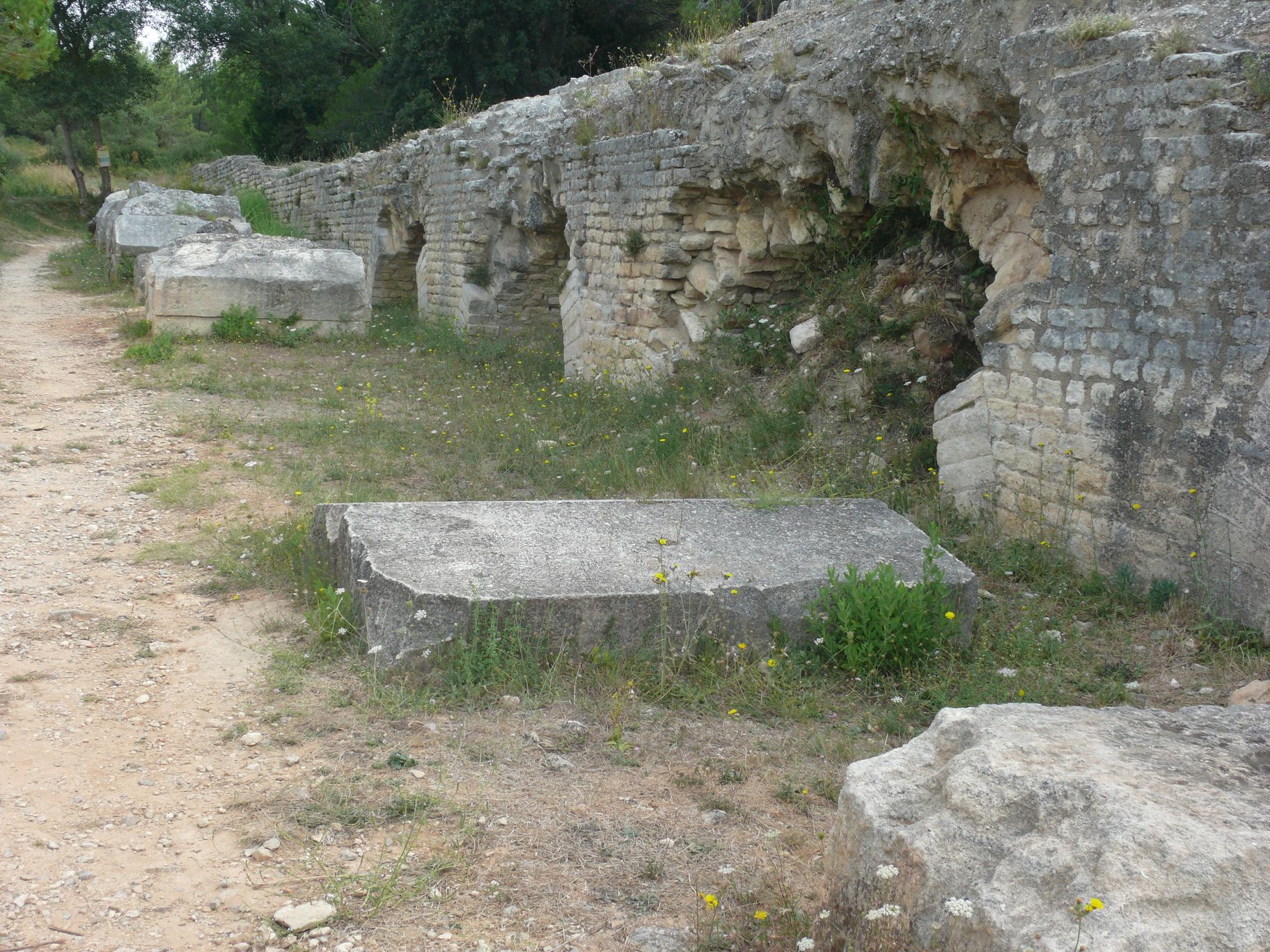 Les piles sont élevées en petit appareil et utilisent parfois à leur soubassement des blocs de grand appareil en réemploi ; les arches sont également en petit appareil, complété par de la brique. Cette façon de procéder se retrouve cependant ponctuellement sur le tracé de l’aqueduc du versant sud, notamment sur le tronçon parallèle à l’aqueduc d’alimentation de la meunerie, ce qui laisse croire que la construction de cette dernière est contemporaine d’une campagne de restauration générale du réseau hydraulique.