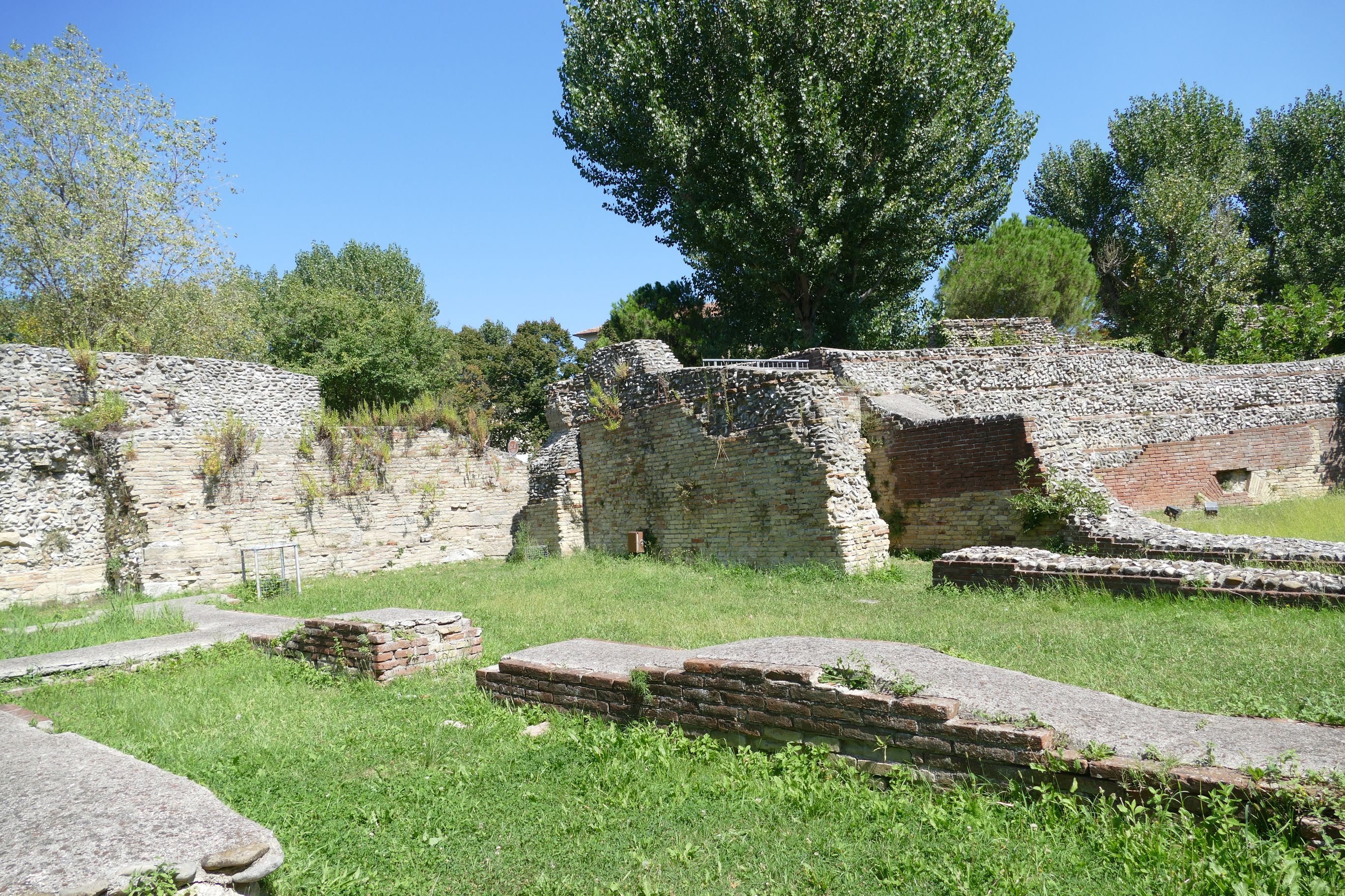 Perdant son activité principale il devient durant le Moyen Age un jardin et on construisit des fours dans les galeries En 1600 un hôpital fut construit sur les ruines .Cet hopital dépendait de l 'eglise et le Monastere di Santa Maria in Turre Muro.On oublie sa présence jusqu'en 1843 lorsqu 'il fut en parti degagé par Luigi Tonini . Mais seulement la moitié des structures ont été dégagées car le secteur sud ouest est recouvert par les habitations nottament le Centro Educativo Italo Svizzero.