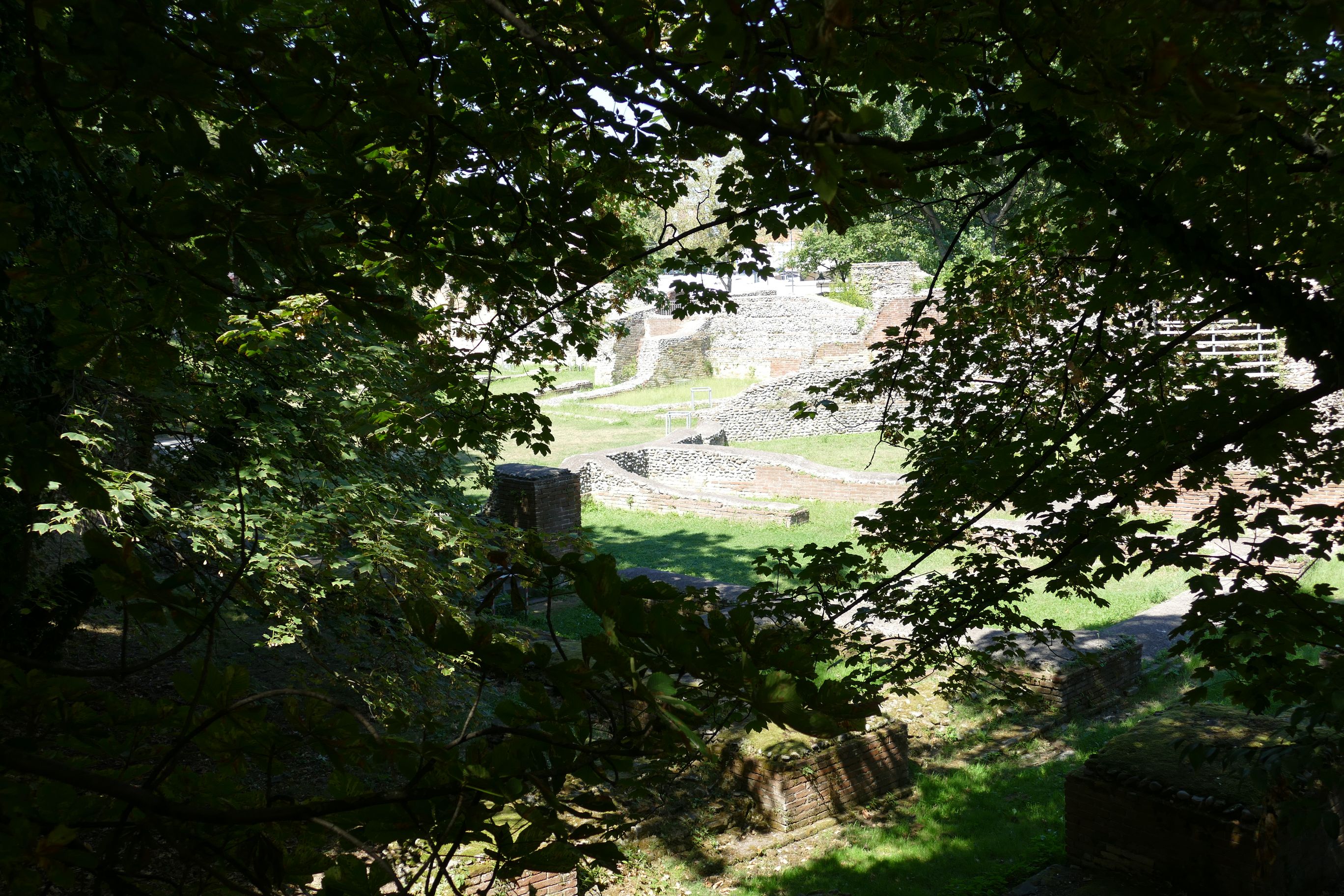 L'Amphithéatre Romain fut construit en périphérie du centre habité d' Ariminum en bord de mer prèsde l ancien lit du fleuve Aprusa devenu Arusa de nos jours . En effet la cote actuelle est plus avancée qu'aus temps de romains .Il fut construit au IIe sièclec Ap JC comme en témoigne une monnaie d'Hadrien (119-138 Ap JC) trouvée dans dans l amphithéatre en un endroit qui n'avait jamais été remanié